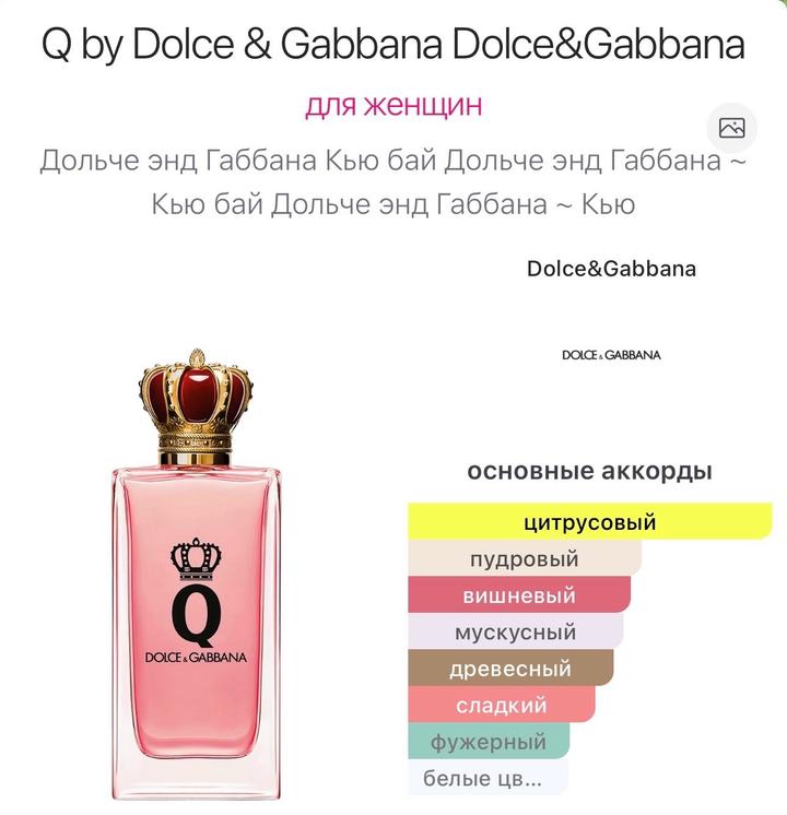 Q by Dolce&Gabbana — аромат для женщин, он принадлежит к группе фужерные фруктовые, выпущен в 2023 году. Парфюмер: Daphné Bugey. Верхние ноты: Сицилийский лимон, Красный апельсин и Жасмин; средние ноты: Вишня и Гелиотроп; базовые ноты: Мускус и Кедр. Новый, в слюде. Приобретен в Летуаль Артикул: 549362