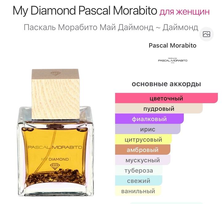My Diamond от Pascal Morabito — без пары распылений. Верхние ноты: Сирень, Магнолия и Лаймовое дерево; средние ноты: Фиалка, Тубероза, Гвоздика (цветок) и Мускатный орех; базовые ноты: Ирис, Амбра, Мускус и Ваниль. Артикул: 549384