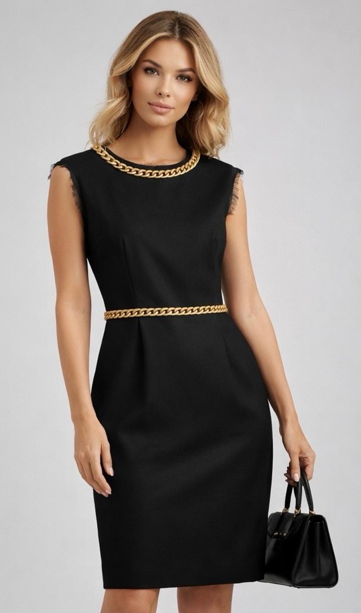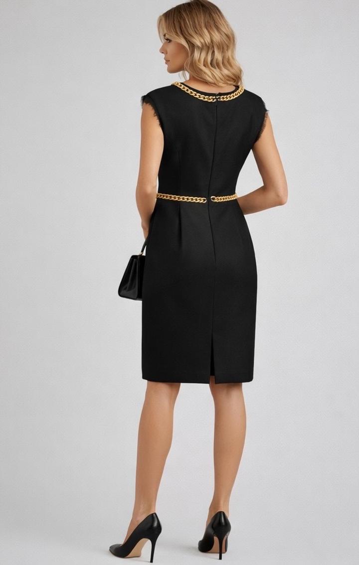 Элегантное базовое платье, которое должно быть в гардеробе каждой женщины Идеально сидит по фигуре и подчёркивает силуэт - натуральная шерсть (98%) — держит форму - универсальный чёрный цвет - стильный акцент - золотая цепь - подходит и для офиса, и для вечернего выхода Идеальное маленькое чёрное платье — вне времени и вне трендов. Сдержанная элегантность с акцентом на золотые цепи придаёт образу статус и стиль Натуральная шерсть обеспечивает идеальную посадку и дорогой внешний вид. Артикул: 549573