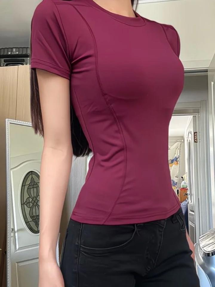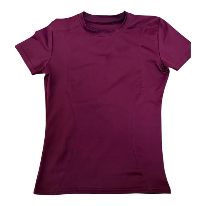 Бордовая облегающая спортивная футболка в стиле рашгарда.Мягкая эластичная ткань плотно прилегает к телу, подчеркивая талию и силуэт, при этом не сковывает движения. Дышащий материал отводит влагу, поэтому футболка отлично подходит как для тренировок, так и для повседневной носки. Артикул: 549753