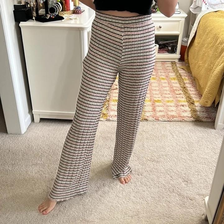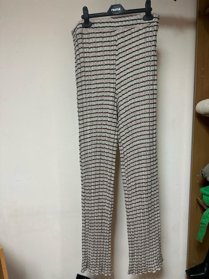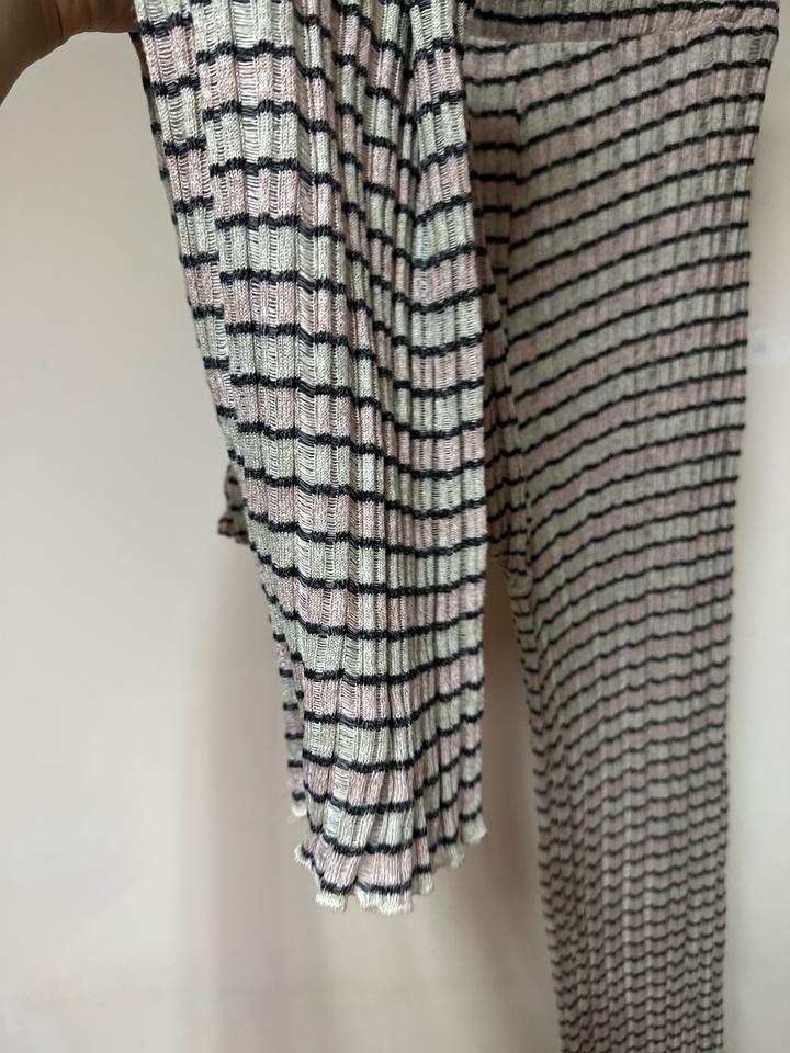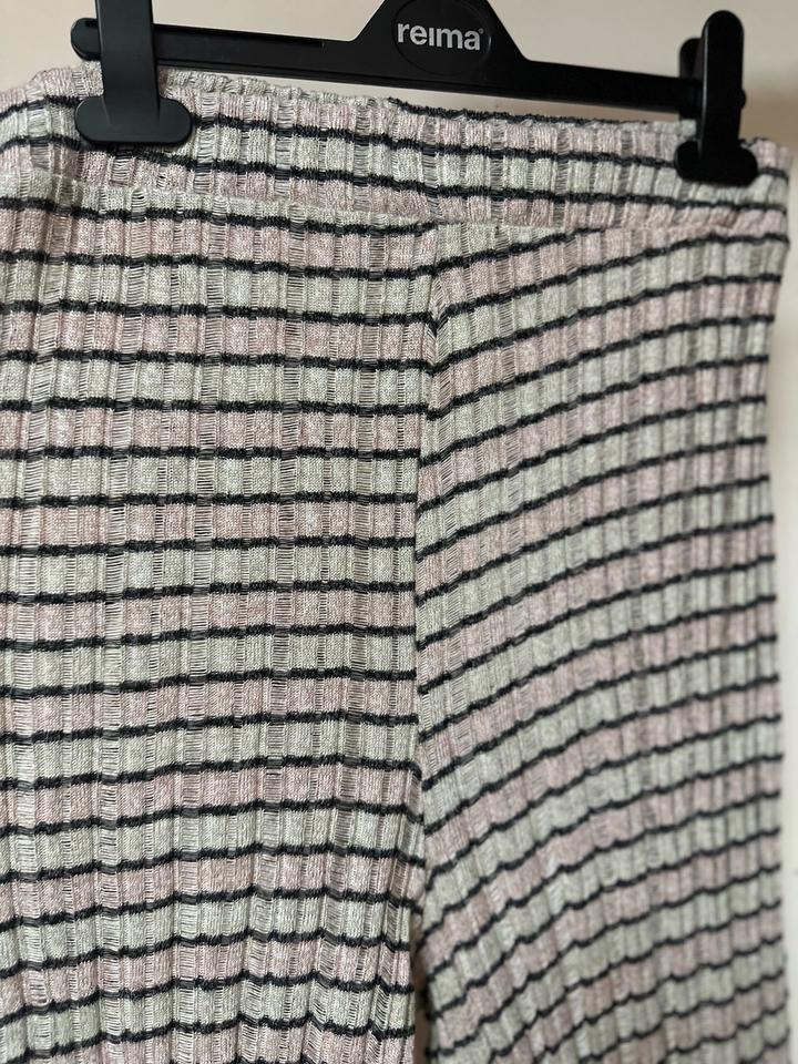 Вязаные брюки в рубчик с деликатным полосатым принтом. Мягкая, приятная к телу ткань (вискоза). Высокая посадка — подчёркивает талию. Прямой крой с лёгким расклёшением книзу. Нейтральная цветовая гамма (молочный + серый + пудровый) легко сочетается с базовым гардеробом Идеальны для образов: — cozy minimal — old money casual — повседневный стиль с акцентом Артикул: 549847