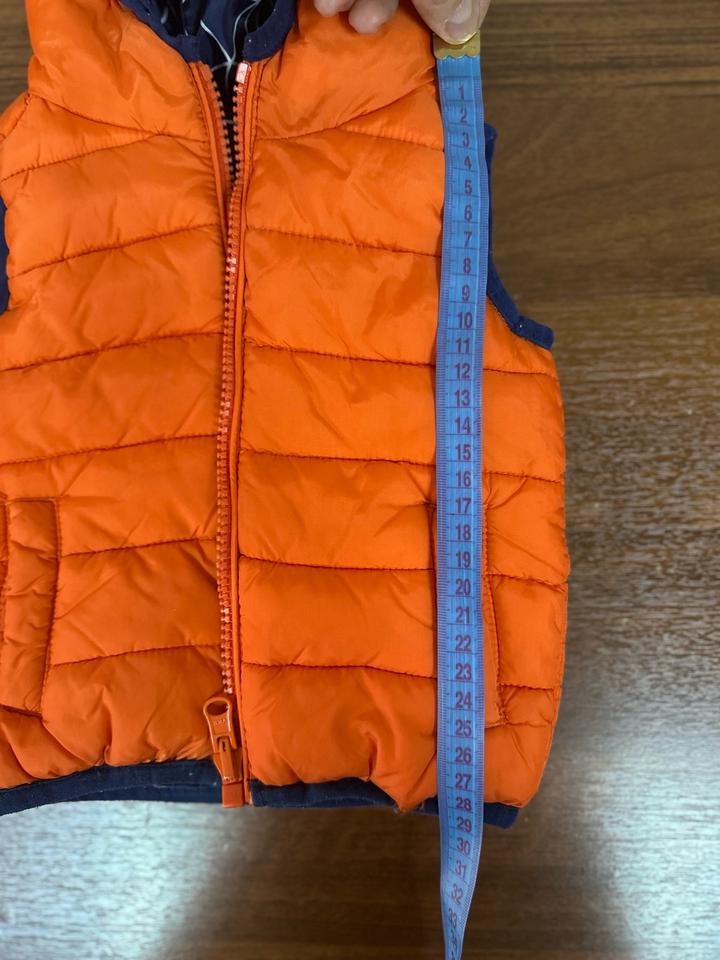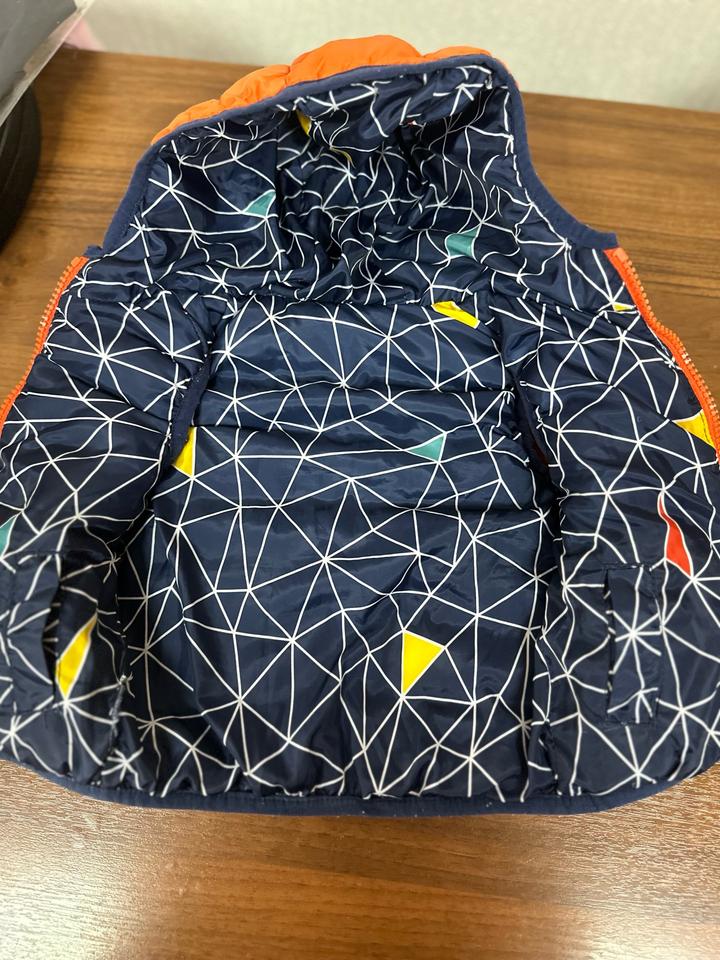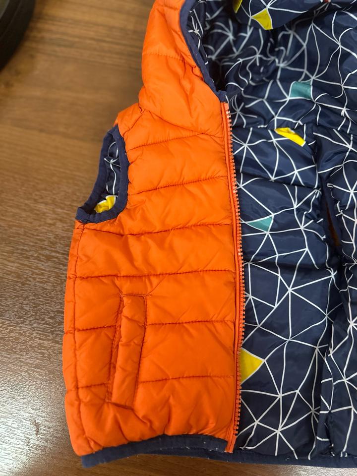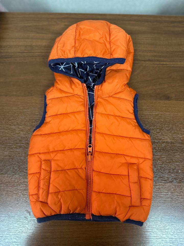 Двусторонняя жилетка с капюшоном. 1 сторона — яркий оранжевый (акцентный, стильный). 2 сторона — тёмно-синяя с геометрическим принтом. Лёгкая, но тёплая — идеально на весну/осень/лето. Удобная молния и карманы Практичная 2 в 1: можно менять образ под настроение. Отлично смотрится как на мальчике, так и на девочке 👶 Артикул: 549866