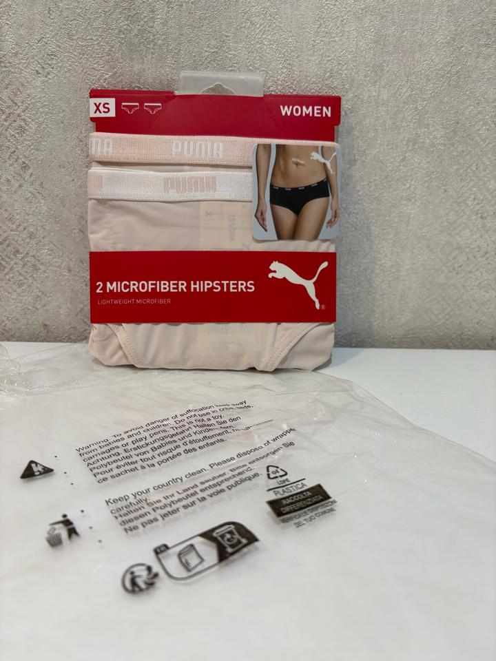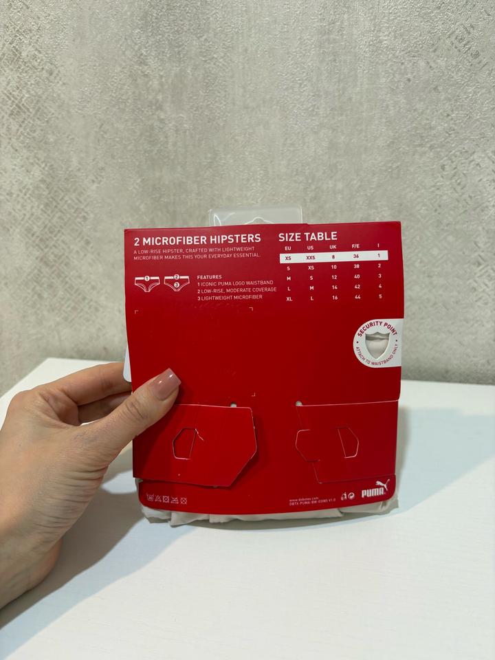 Абсолютно новые, оригинал. Заказывала для себя - обычно ношу белье PUMA размер XS, и всё всегда подходит. Но у этой модели трусиков немного другой крой, поэтому даже визуально стало понятно, что на XS будут великоваты. Идеально подойдут на размер S - сядут комфортно и красиво. В упаковке 2шт Артикул: 550224