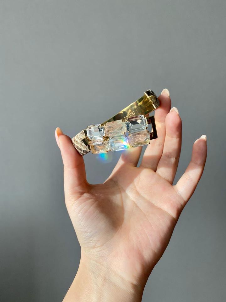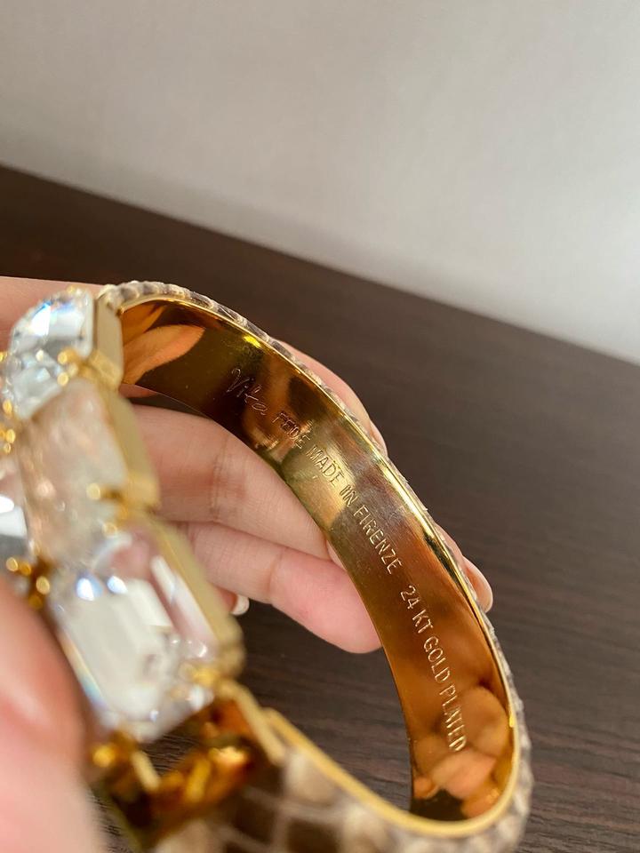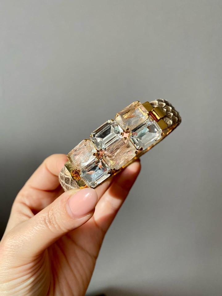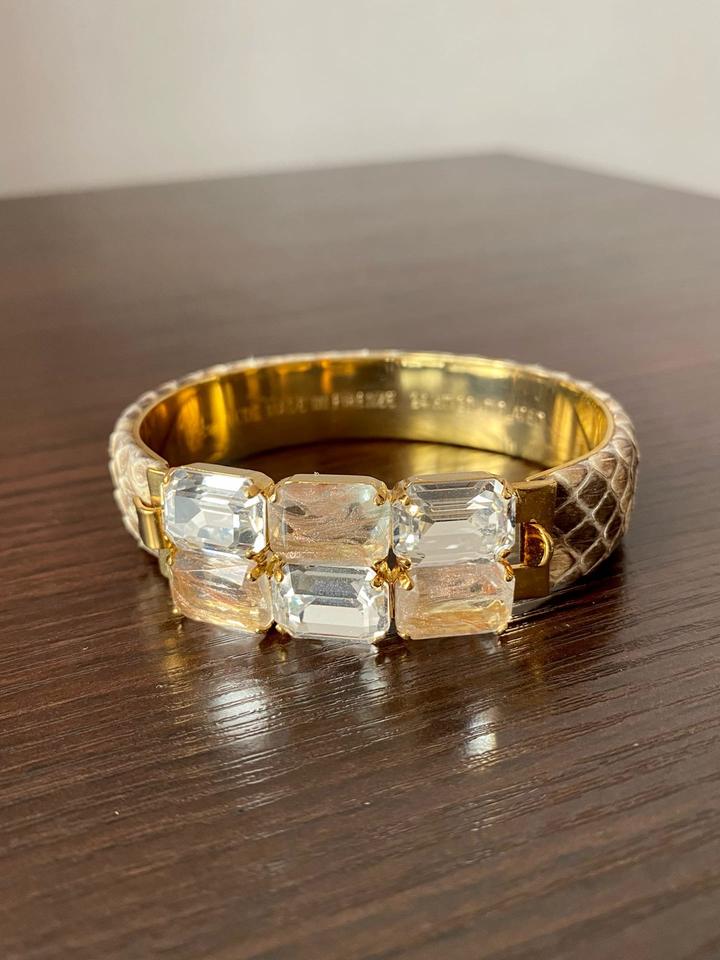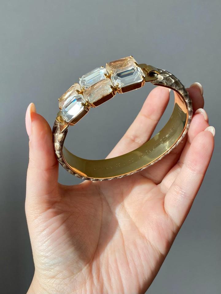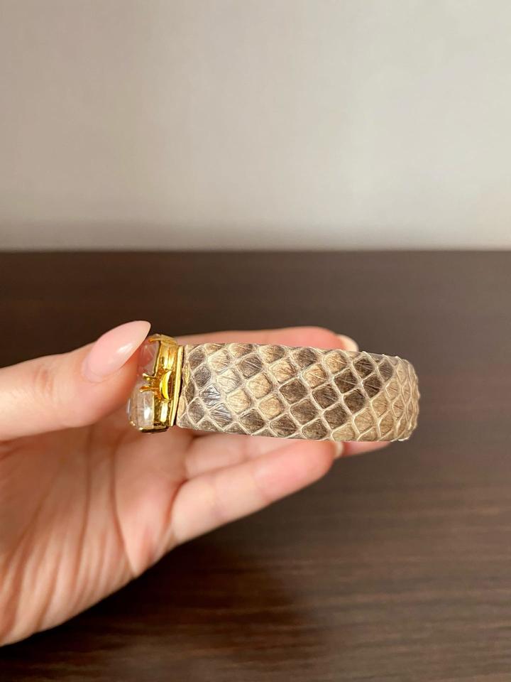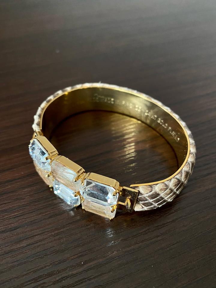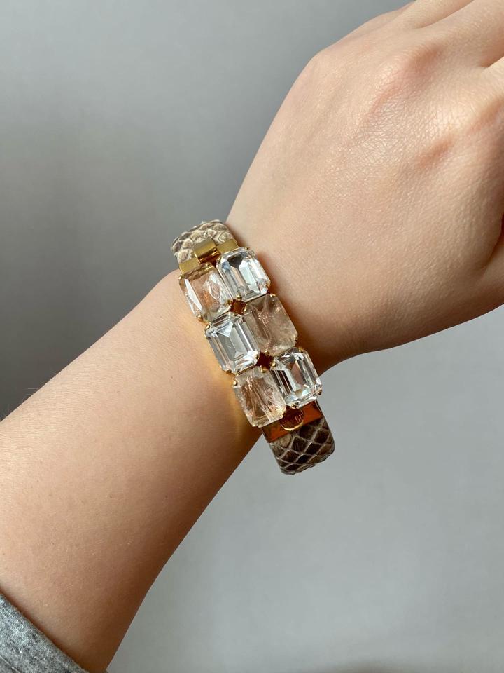 Новый браслет, производство Италия, Vita Fede. Отделка из кожи питона, 24-каратная позолота, стразы. Очень красиво сверкает при освещении. Стильный и необычный акцентный аксессуар. Привезли из Италии, но, к сожалению, мне не подошел по размеру. Большой для моего запястья, подойдет на обхват 18-19 см. Артикул: 550353