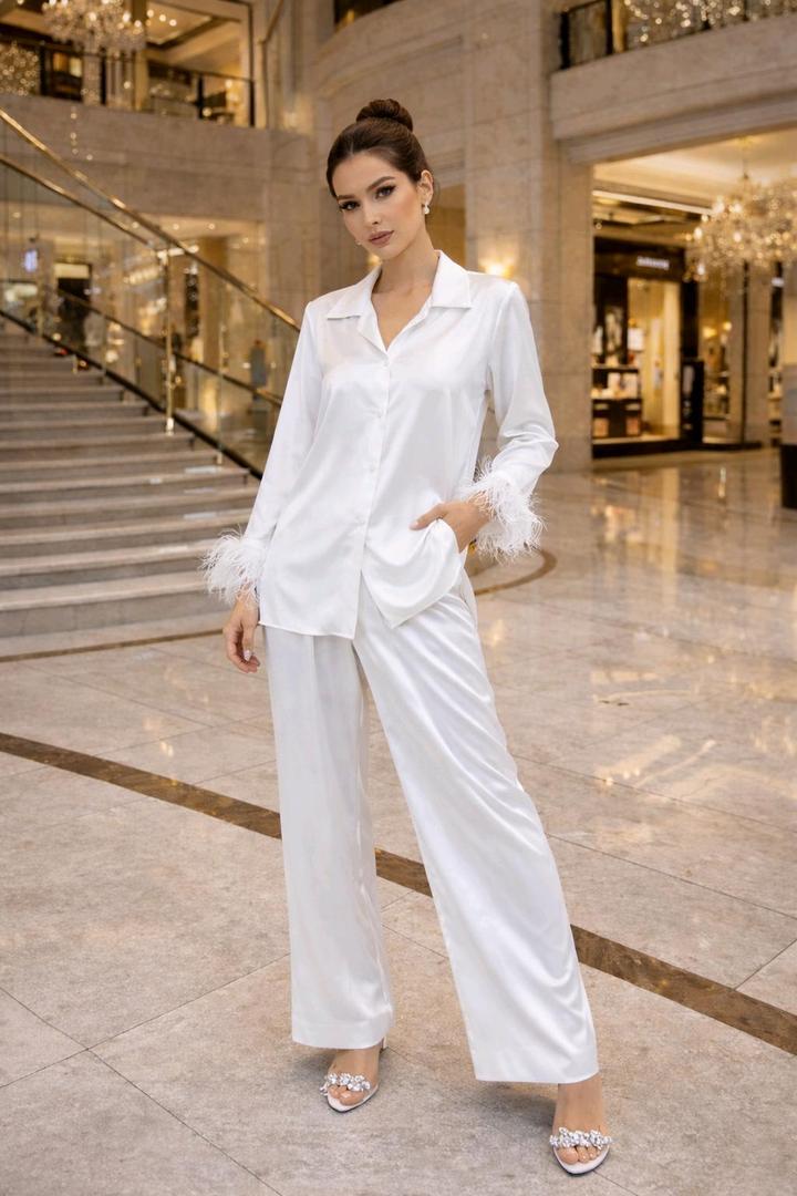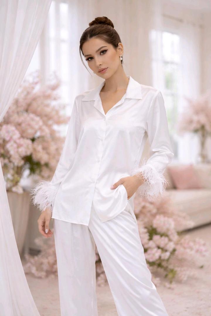 Изысканный комплект для тех, кто ценит утонченность и стиль. Лёгкая струящаяся ткань мягко ложится по фигуре, создавая ощущение комфорта и роскоши одновременно. Рубашка свободного кроя с деликатными перьями на манжетах добавляет образу воздушности и уникальности, а прямые брюки подчёркивают силуэт и визуально удлиняют ноги. Идеален для: — фотосессий и съёмок — мероприятий и вечеринок — стильных выходов и travel-образов — премиальная мягкая ткань — акцентные перья на рукавах Артикул: 550391