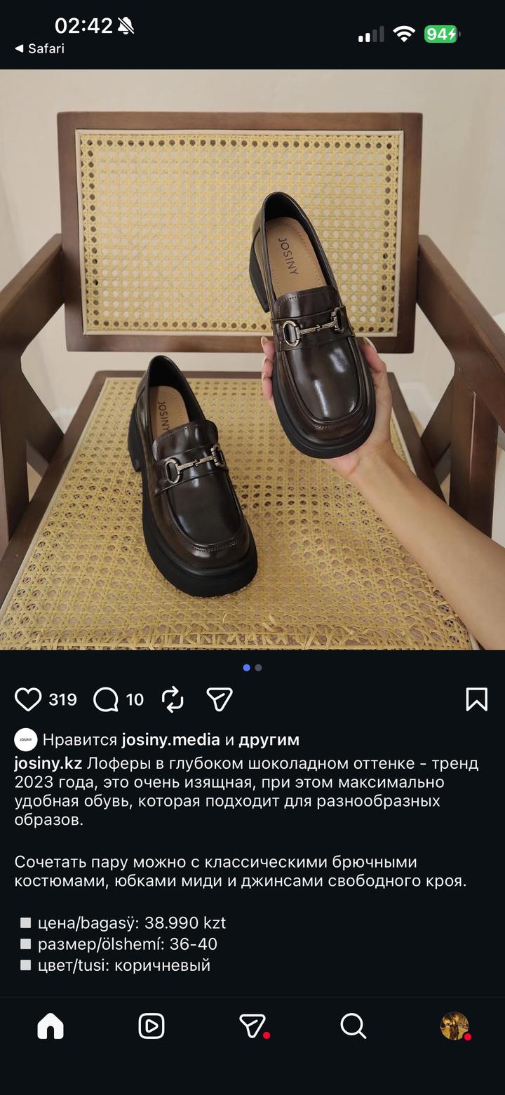 Лоферы в глубоком шоколадном оттенке🤎 это очень изящная, мягкая как облачко стелька , максимально удобная обувь, которая подходит для разнообразных образов. Абсолютно новые . Размер 36. Продаю так как покупала зимой , и сейчас в связи с беременностью они малы 🥹 Артикул: 550440