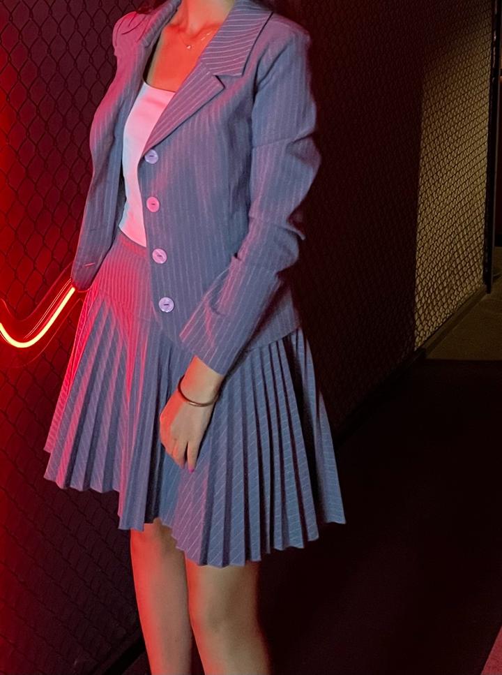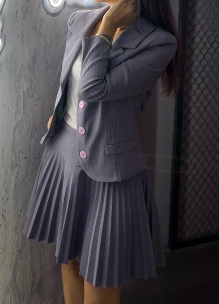 Серый костюм двойка с розовыми полосками. С розовым подкладом Артикул: 550769