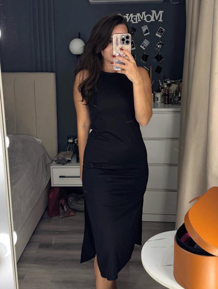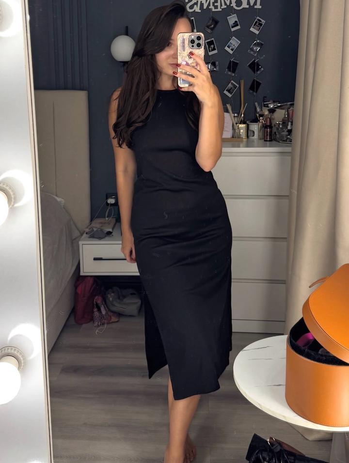 Черное платье длины миди с боковыми разрезами из плотного качественного материала, на размер S-M у подруги был свой бренд одежды и цех, шили сами покупала у неё и это было любимое платье, но сейчас к сожалению сидит уже не так, как раньше, решила дать ему новую жизнь и оторвать от сердца, носила с рубашками сверху Артикул: 550983