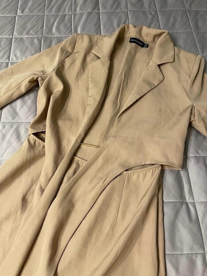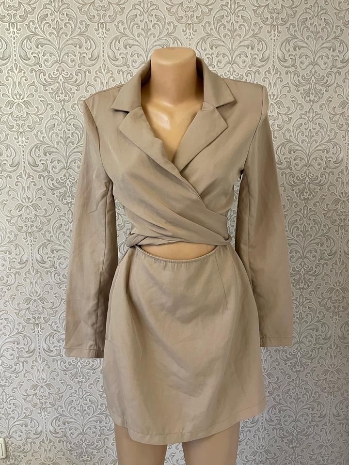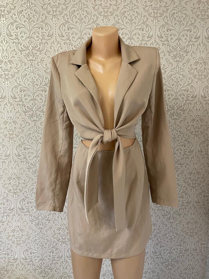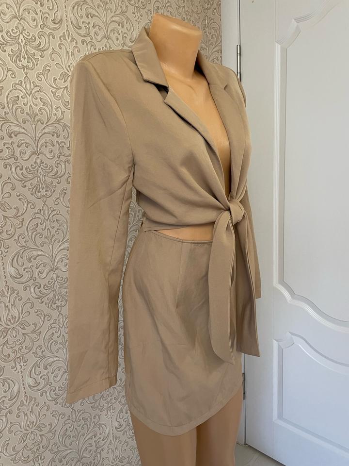 Эффектное платье-пиджак от PrettyLittleThing в бежевом цвете. Особенность модели- вырезы по бокам на талии, подчёркнутые широким поясом, который завязывается спереди. Такой крой придаёт образу элегантность и добавляет изюминку. Артикул: 551501