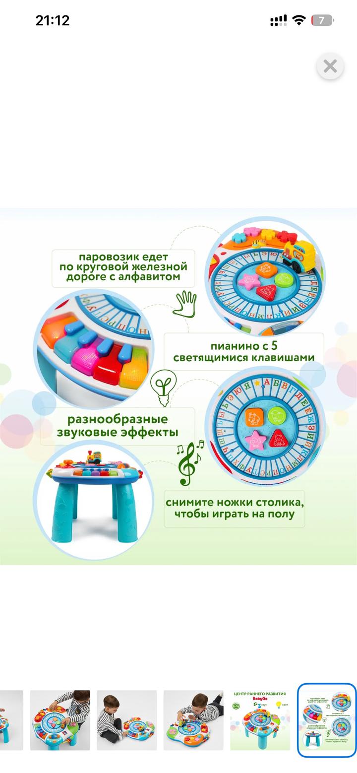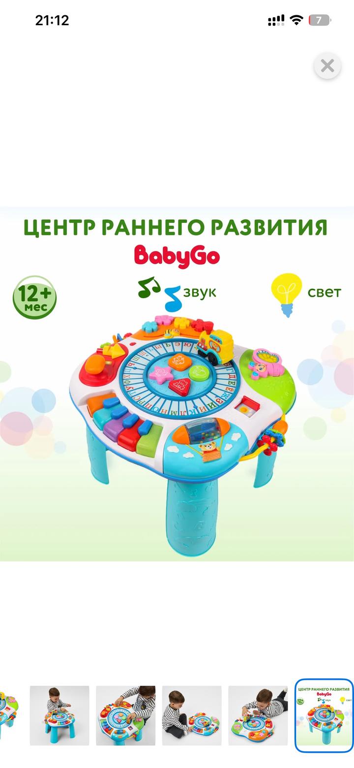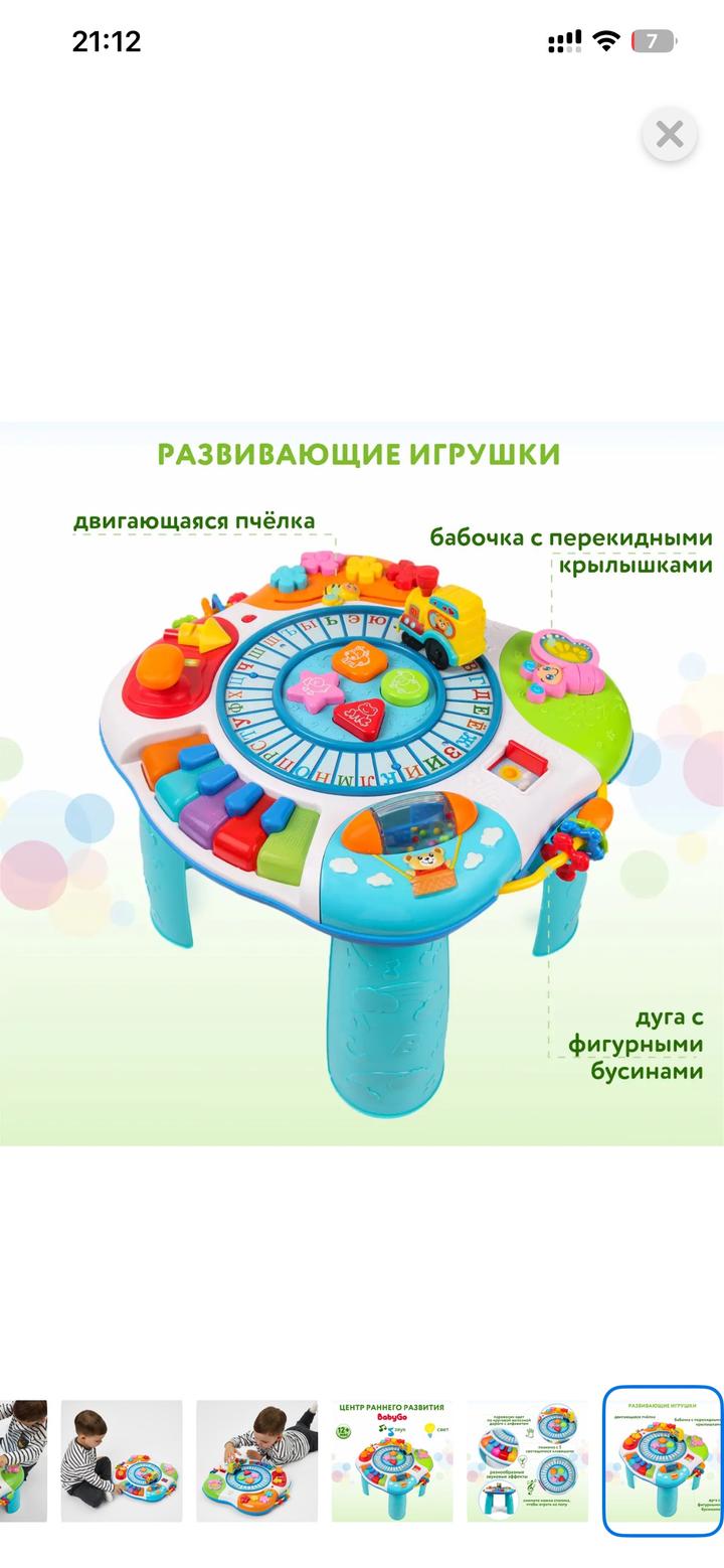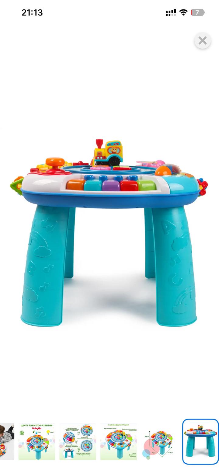 Центр раннего развития BabyGo Развивающий музыкальный столик BabyGo - такой интересный! Малыш с удовольствием будет играть на пианино и изучать интерактивные игрушки. Паровозик едет по круговой железной дороге с алфавитом. Пианино с 5 светящимися клавишами. Разнообразные звуковые эффекты. Развивающие игрушки: бабочка с перекидными крылышками, дуга с фигурными бусинами, двигающаяся пчёлка. Снимите ножки столика, чтобы играть на полу. Артикул: 551988