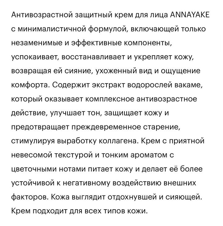 Почти не использованный крем. 50ml. Антивозрастной защитный крем для лица ANNAYAKE с минималистичной формулой, включающей только незаменимые и эффективные компоненты, успокаивает, восстанавливает и укрепляет кожу, возвращая ей сияние, ухоженный вид и ощущение комфорта. Содержит экстракт водорослей вакаме, который оказывает комплексное антивозрастное действие, улучшает тон, защищает кожу и предотвращает преждевременное старение, стимулируя выработку коллагена. Артикул: 552065