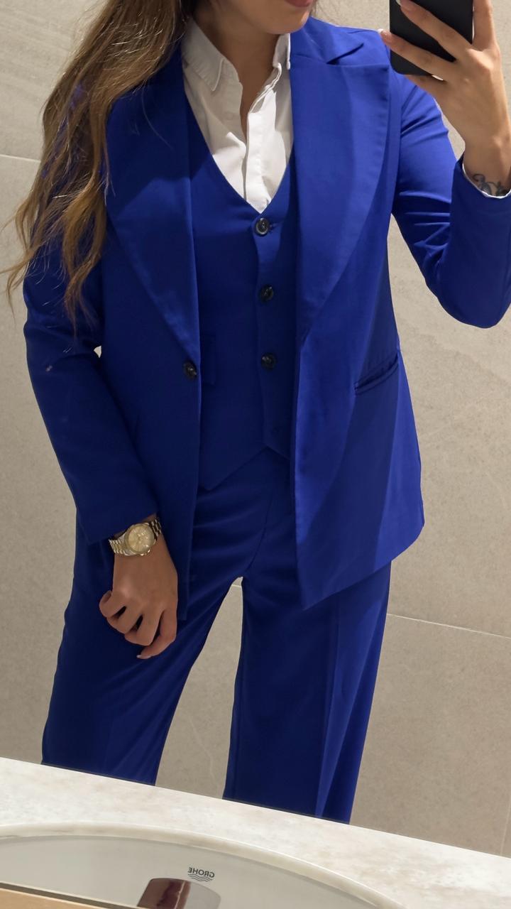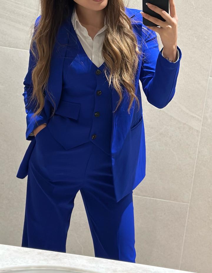 Шикарный костюм-тройка Royal Blue 💙. Идеальное состояние! Эффектный комплект: легкий пиджак без подклада, жилетка идеально сидит по талии и брюки на высокой посадке. Ткань очень приятная, не сковывает движения. Идеально для офиса или вечернего выхода. Элементы можно носить по отдельности. • Размер: маркировка 44 (лучше на 42–44, можно на небольшой 46). • Рост: на 165 см идеально и с каблуком, и с кедами. Стильный, яркий и комфортный - в нем вы не останетесь незамеченной! Артикул: 552472