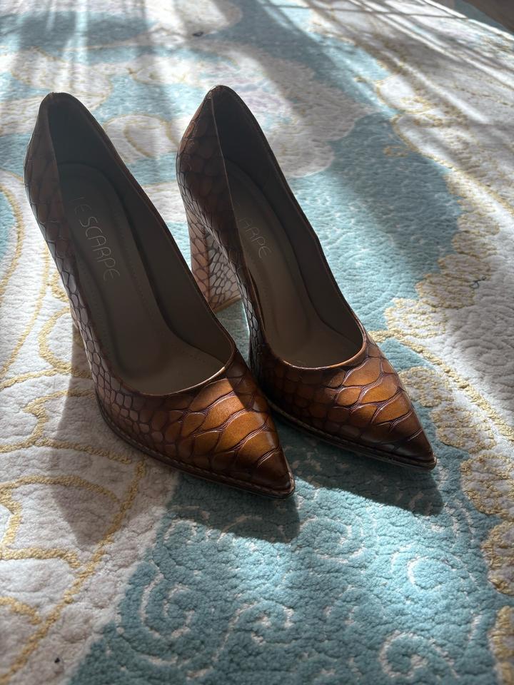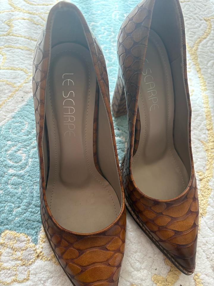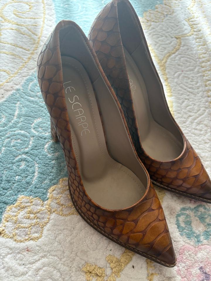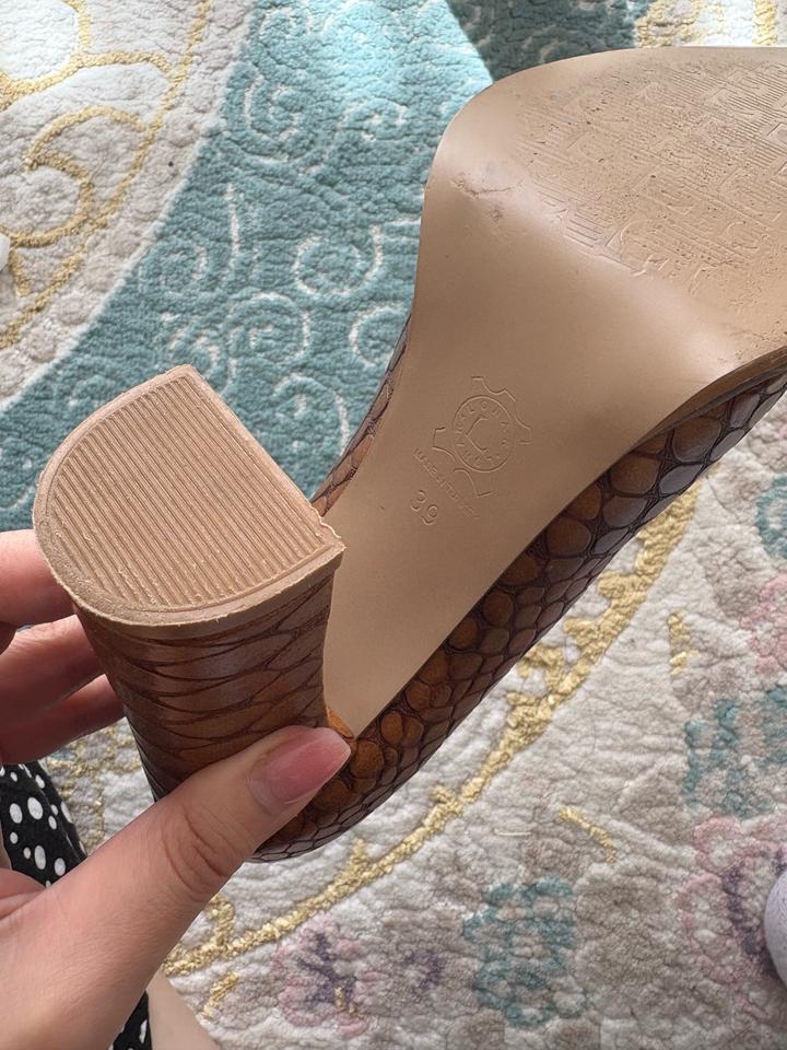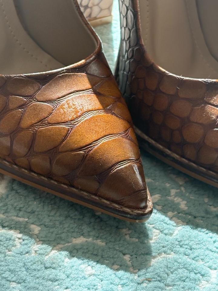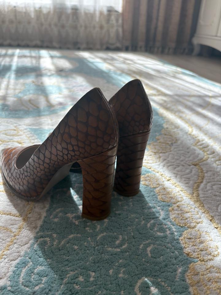 Стильные женские туфли на каблуке в красивом коричневом оттенке с эффектом под кожу рептилии. Надевались всего 1 раз состояние практически новое. Удобная колодка, устойчивый каблук, отлично смотрятся как с классикой, так и с повседневной одеждой. Продаю, потому что не ношу. Артикул: 552869