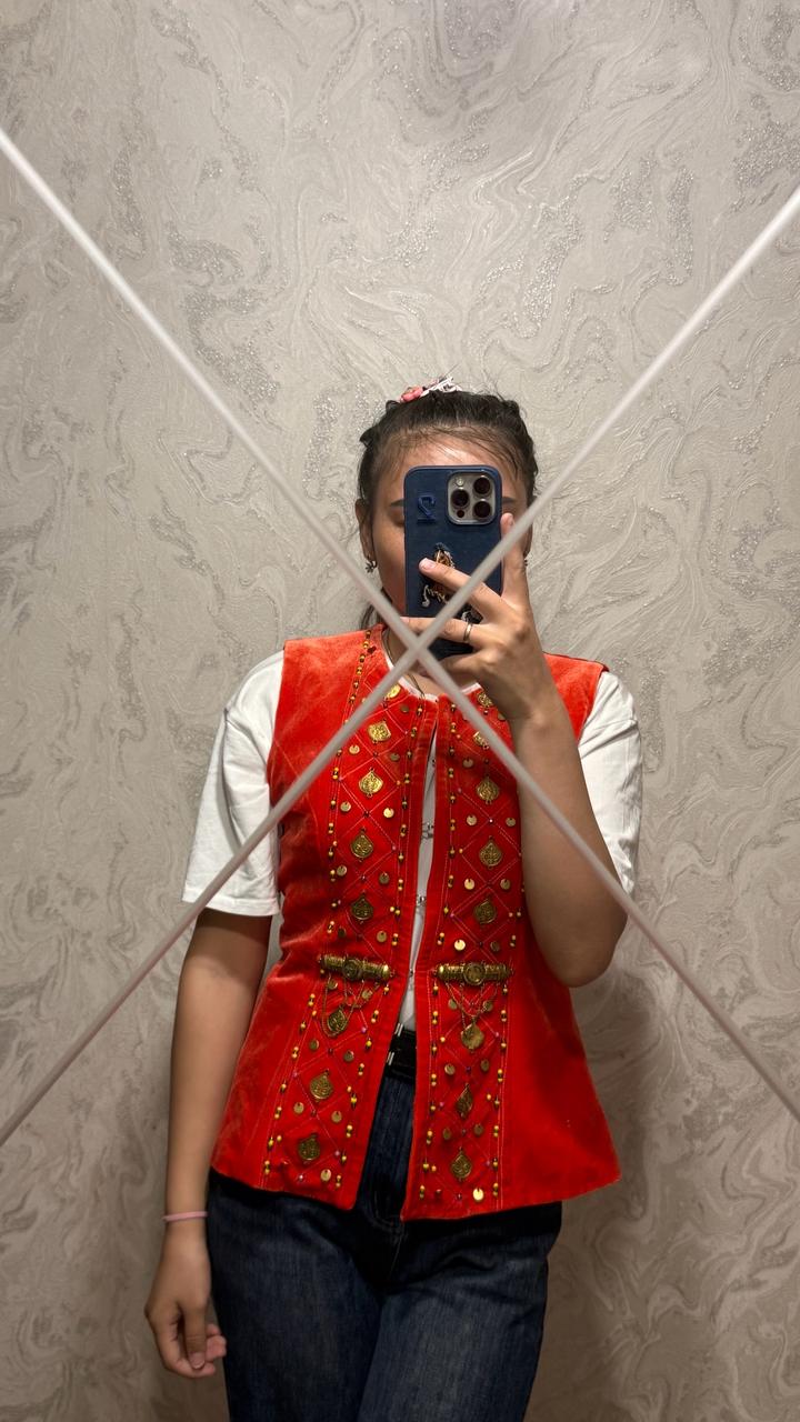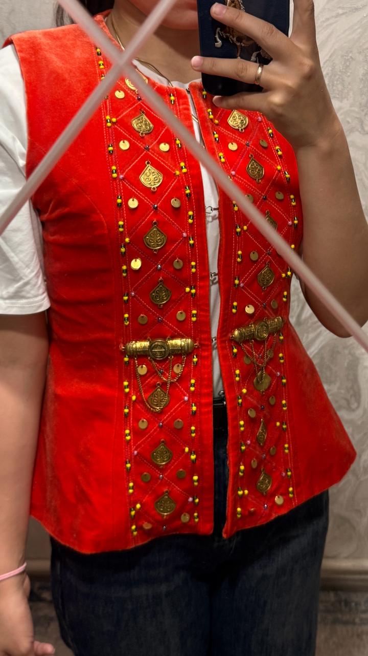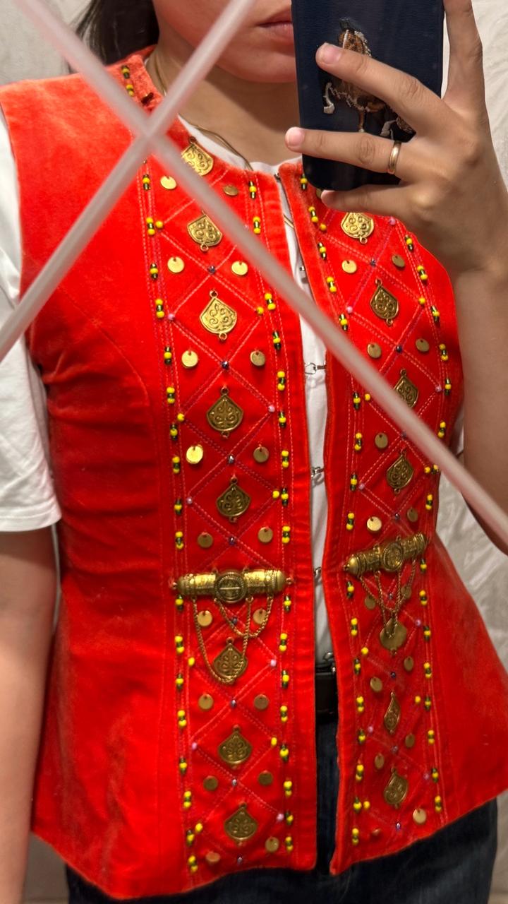 Этот жакет выглядит очень ярко и выразительно — он явно вдохновлён традиционными этническими мотивами. Насыщенный оранжевый цвет сразу притягивает внимание и ассоциируется с энергией, праздником и уверенностью. Декор — главная изюминка: золотистые подвески, монетки и орнаменты создают эффект богатства и ручной работы. Мелкие бусины и вышивка добавляют детализации и делают вещь уникальной, почти как украшение, а не просто одежду. Фасон приталенный, без рукавов, что делает жакет более современны Артикул: 552891