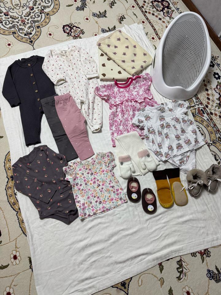 Детская одежда,на рост 80-86 все были надеты по 2-3 раза только на выход, 2 брючки футболка и кофточка Боди для дома. Платье розовое и рядом белое по 1 раз надели.пинетки натуральная кожа, желтые носочки новые и пинетки коричневые в идеальном состоянии. Лежак для купания до 13 кг. Бутылочка с серной ложечкой, для кормления ребенка новая. Артикул: 553422