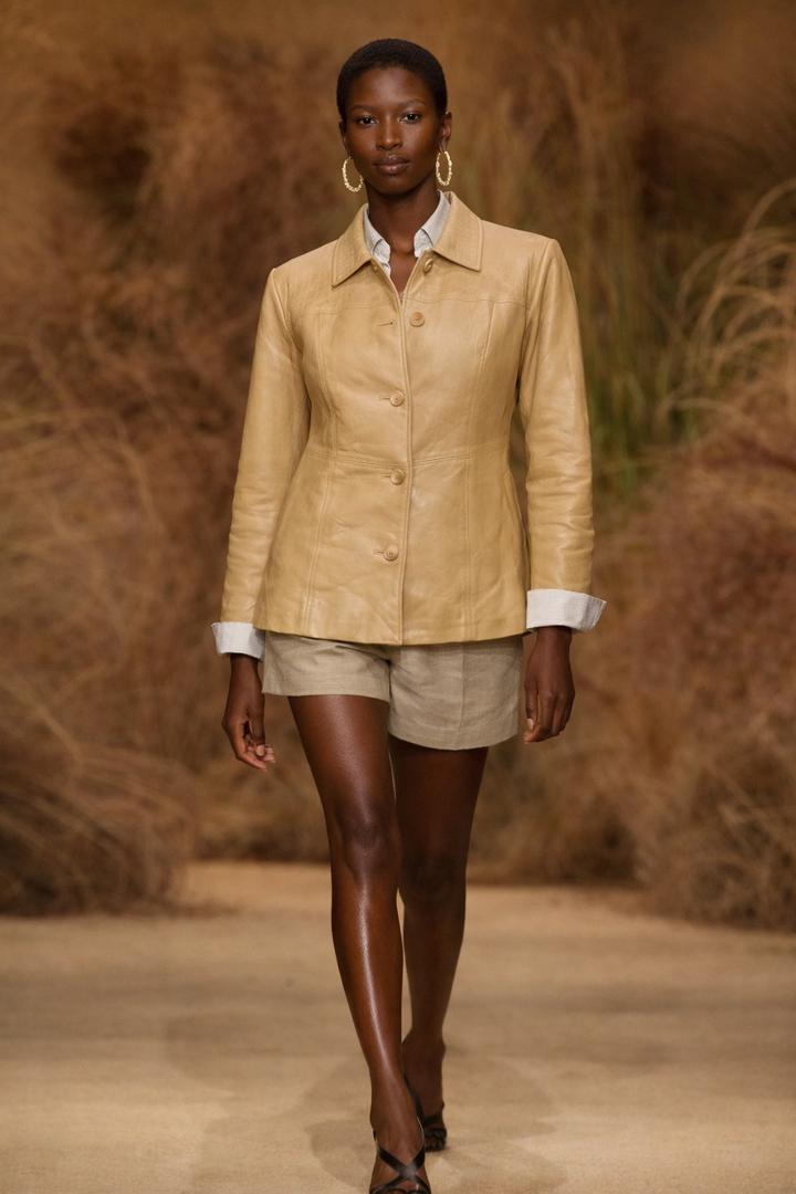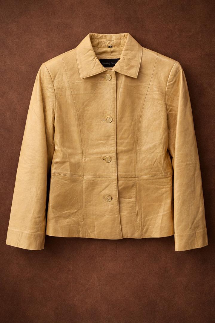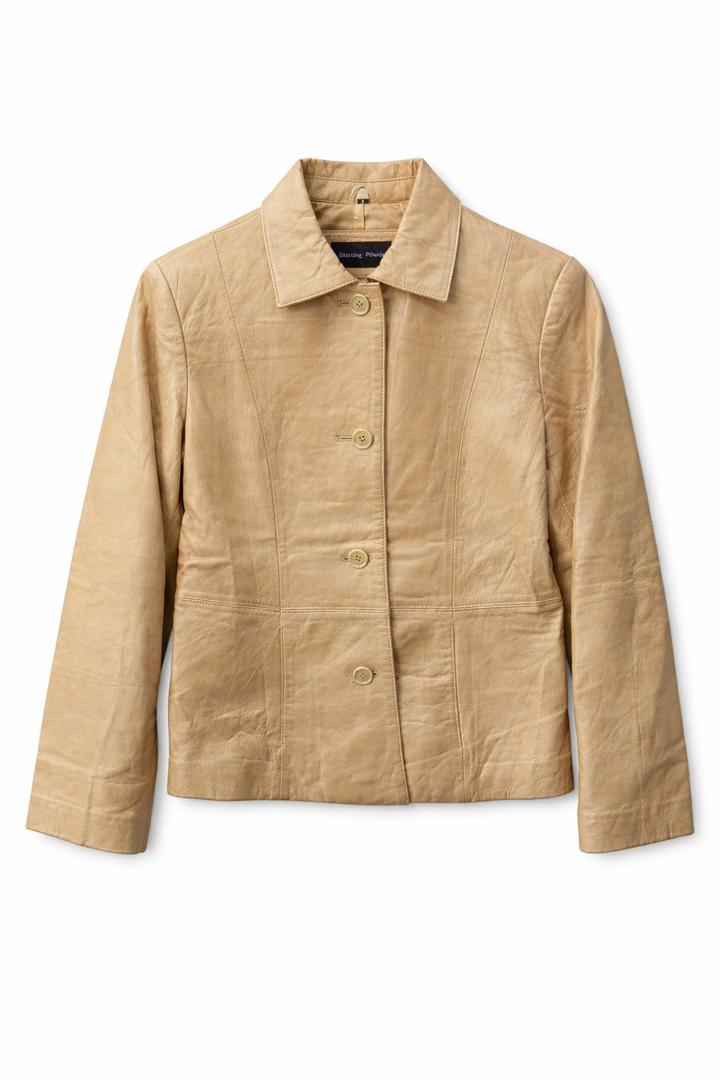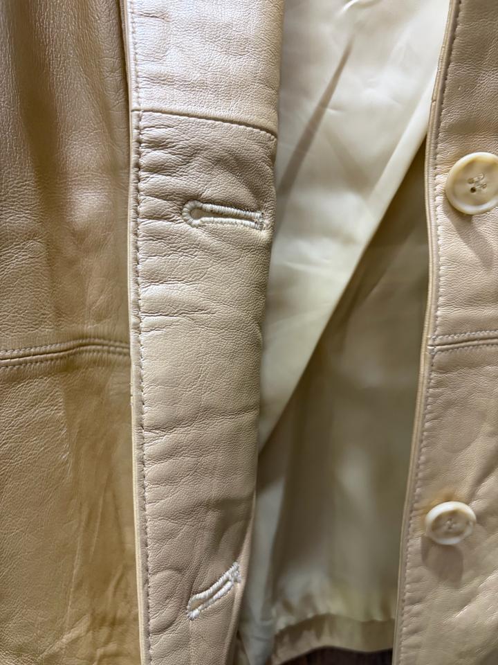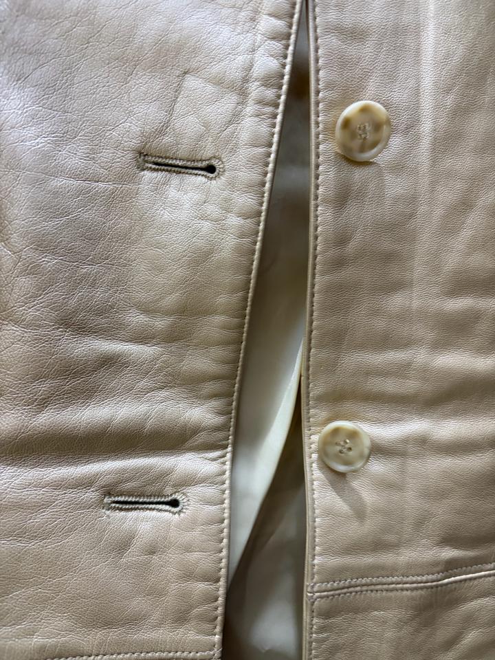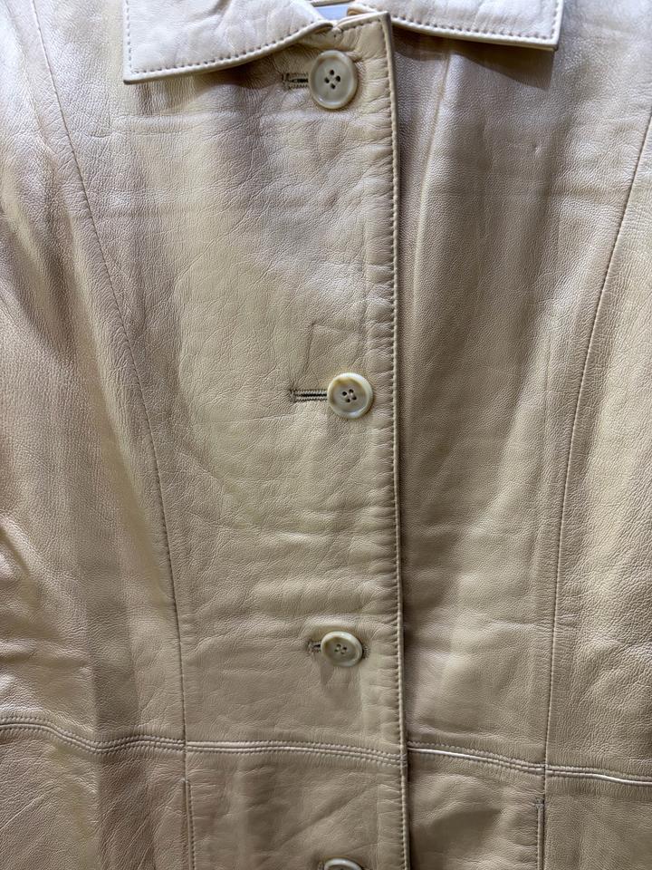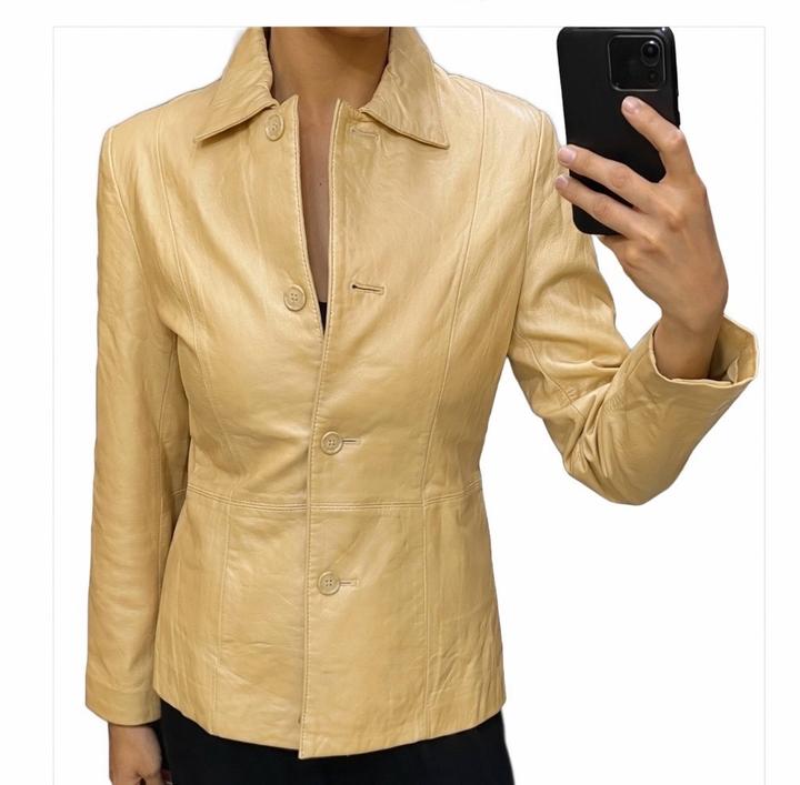 Бежевый кожаный жакет классического кроя с отложным воротником и пуговицами в тон. Мягкая натуральная фактура кожи. Идеально на XS, на S тоже отлично если носить расстегнутым или оставить незастегнутой верхнюю пуговицу, как на мне. Артикул: 553791