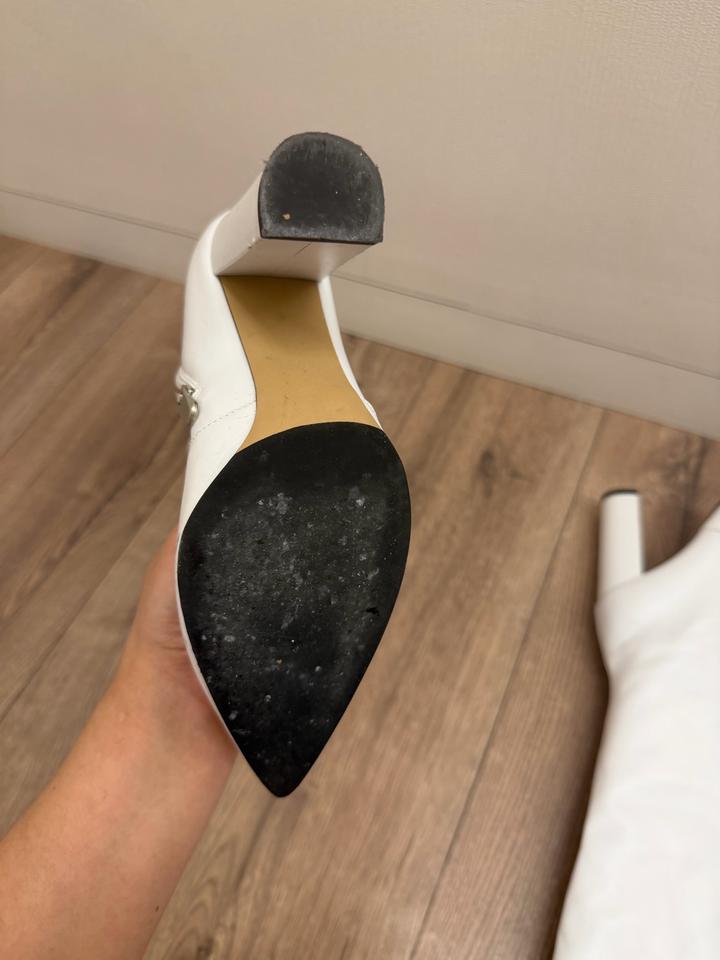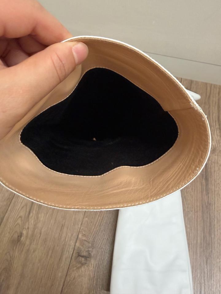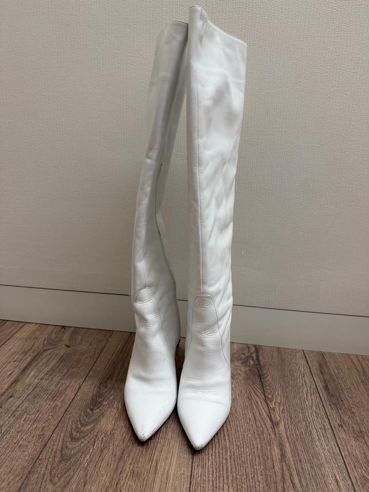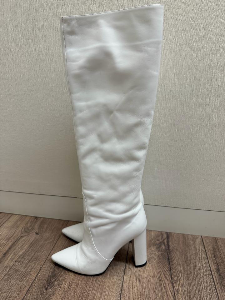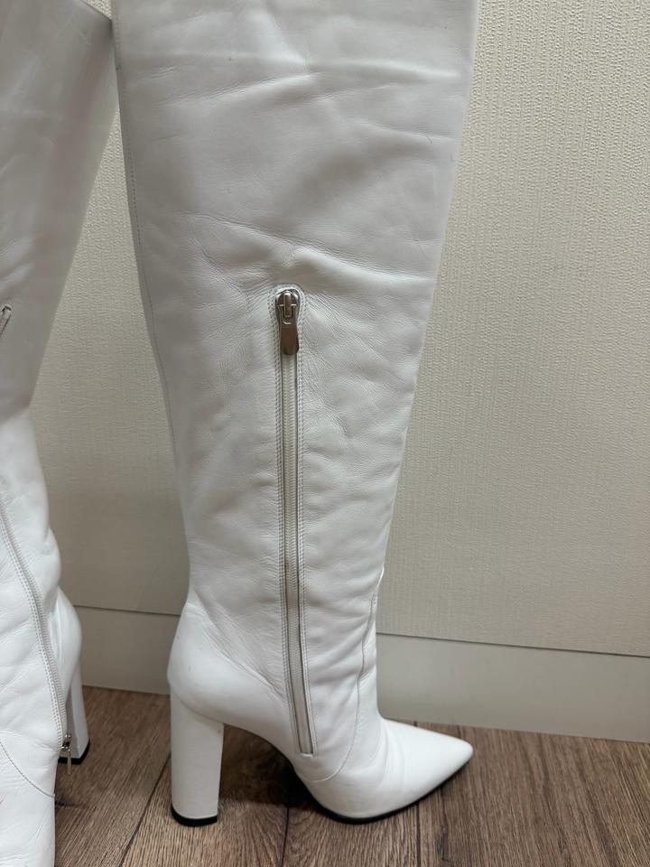 Сапоги белые, кожа буфала, высококачественная кожа , турция. Носила только 2 раза. Оказались малы в зоне икр. Внутри тонкая байка. Размер 37 Артикул: 553860