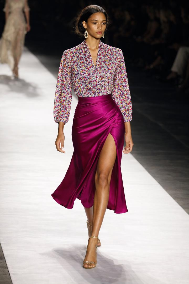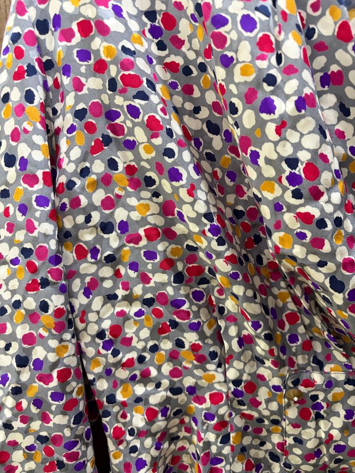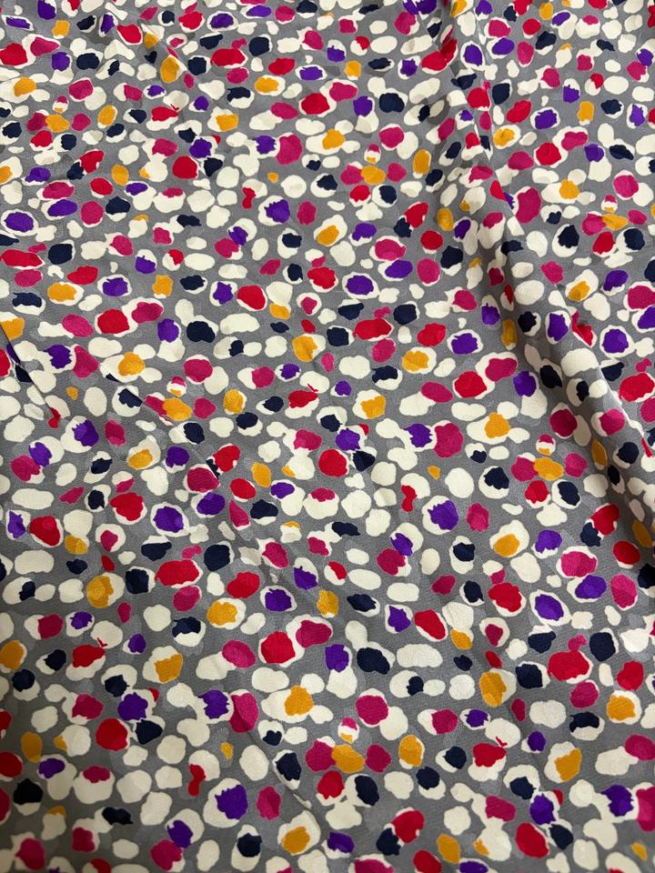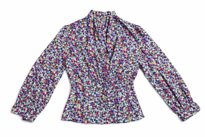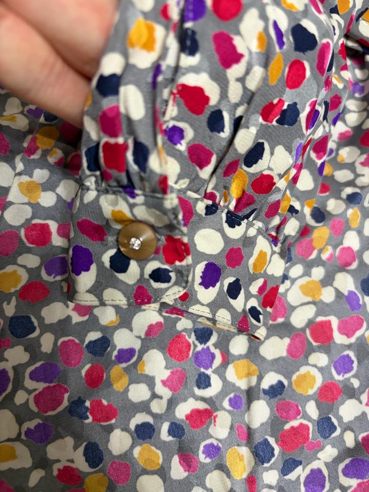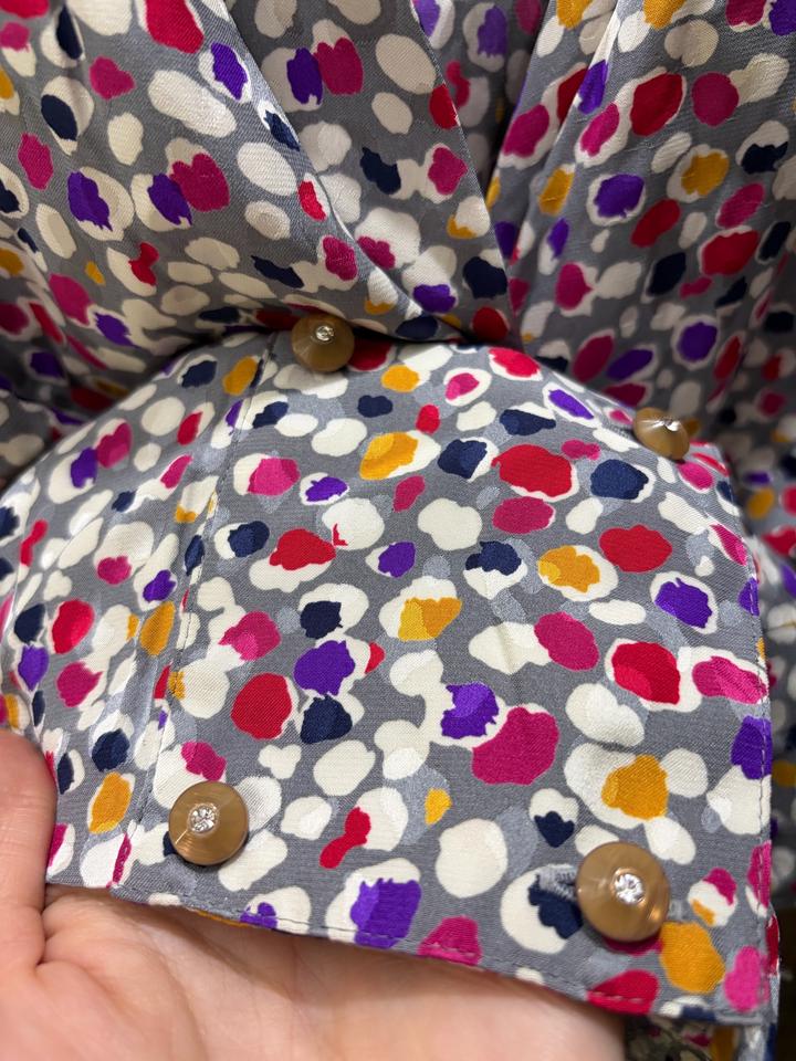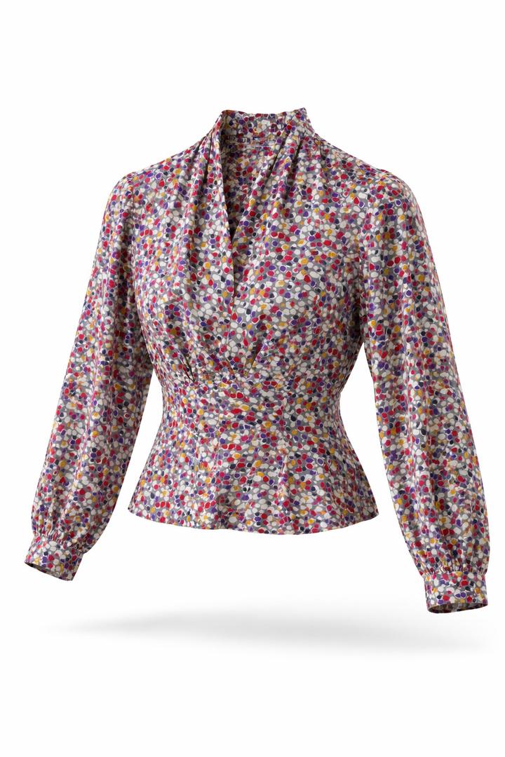 Французская блузка с драпированным воротом и ярким абстрактным принтом, рукава до запястья. Очень женственно, с акцентом на талию и плавный силуэт. Артикул: 553892