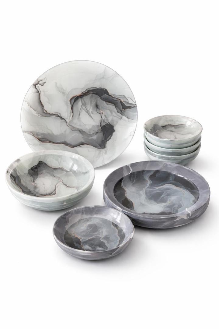Стильный набор посуды с мраморным дизайном Идеально подойдёт для сервировки стола — выглядит дорого и современно. В наборе: 25 предметов на 6 персон ✔️ Супница ✔️ Большая и маленькая сервировочные тарелки ✔️ Салатницы Производство: Иран Отличный вариант как для дома, так и в подарок Артикул: 553993