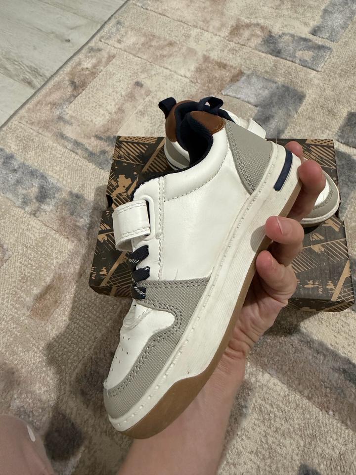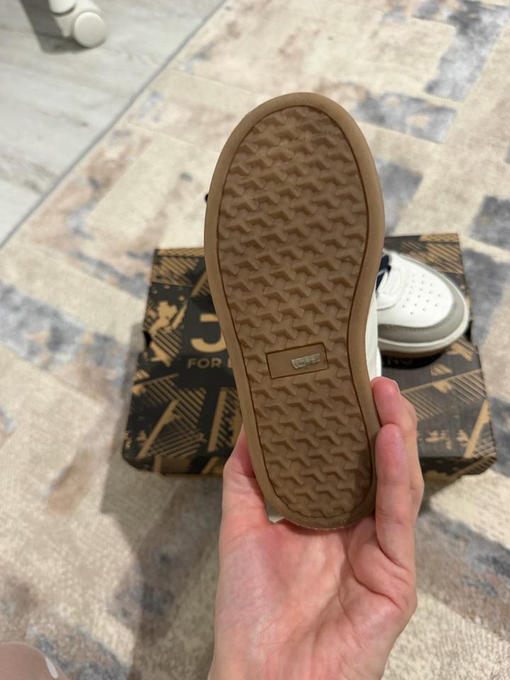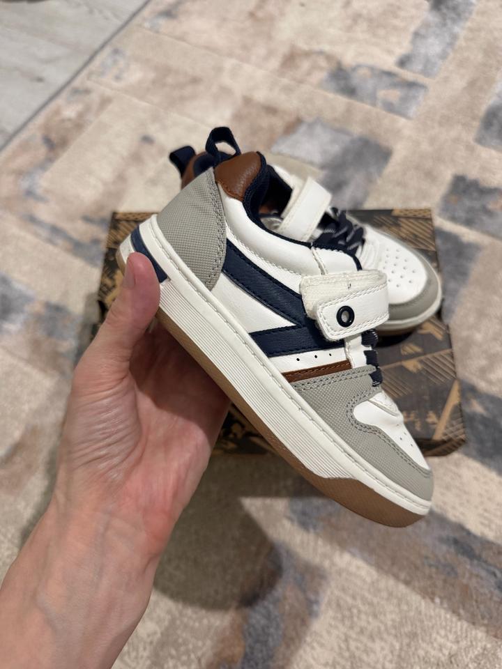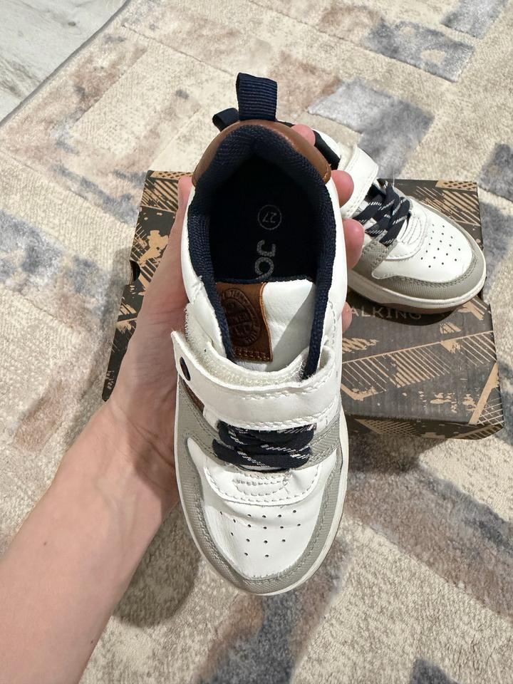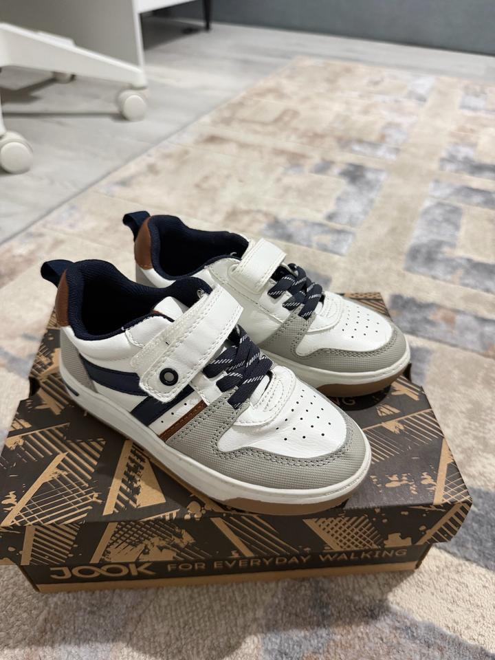 Белые полуботинки для мальчика Jook с контрастными вставками. Подкладка и стелька из текстиля на основе переработанных материалов. Без супинатора. Фиксация: шнуровка-резинка и ремешок. Толстая рифлёная подошва. Демисезон: весна, осень. Артикул: 554001