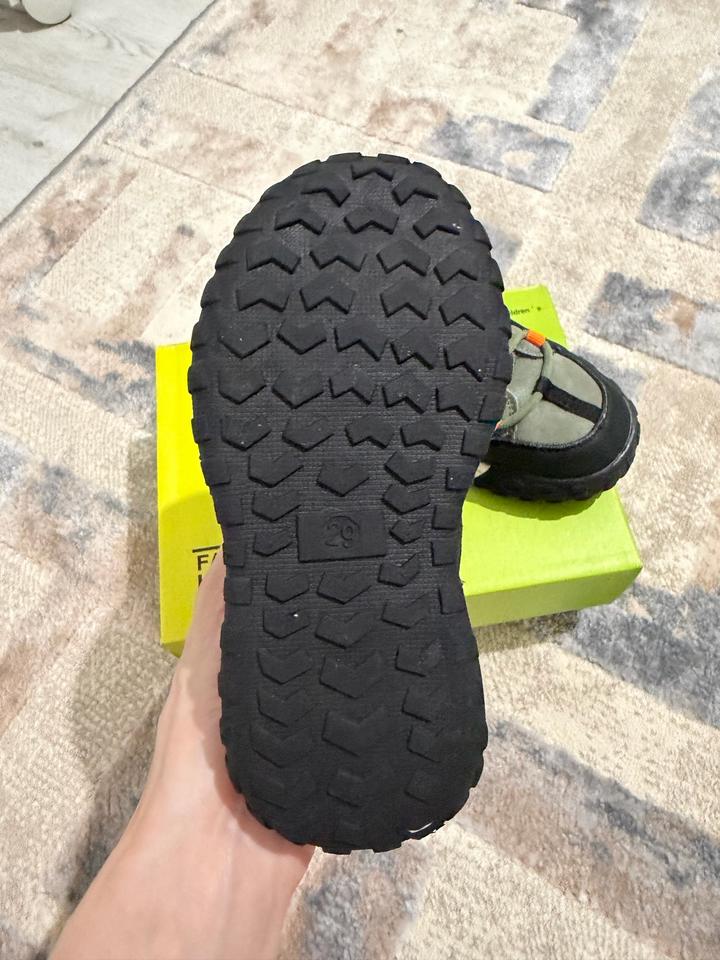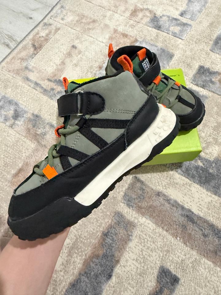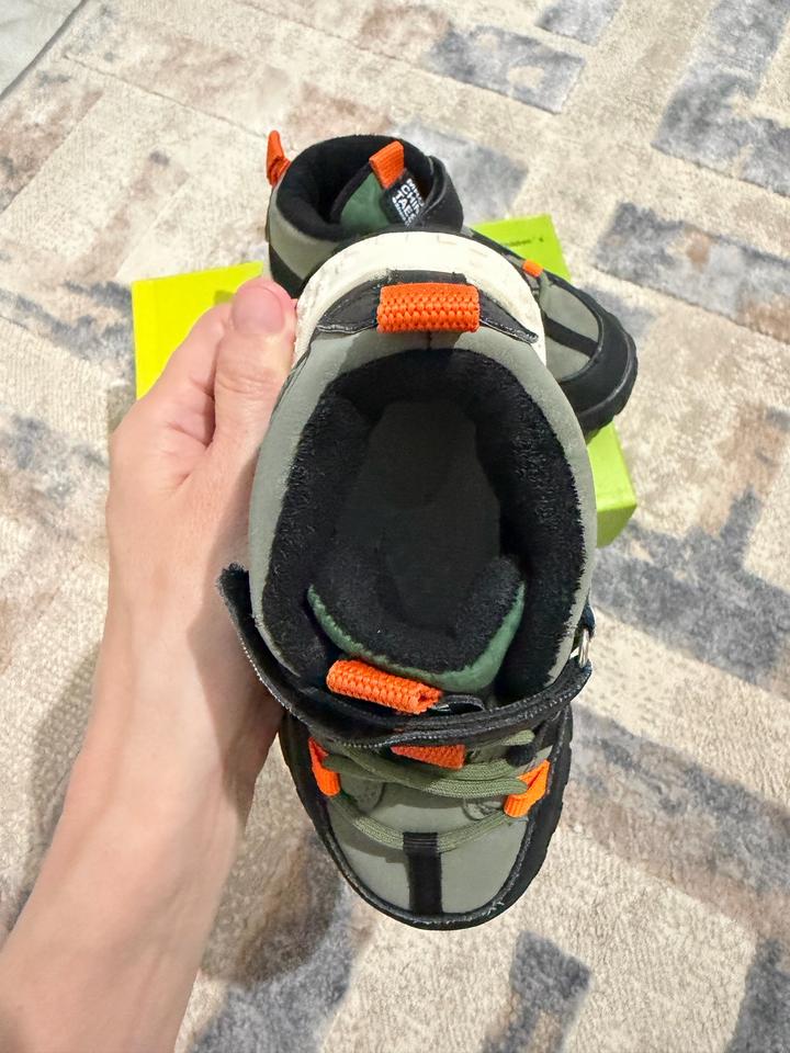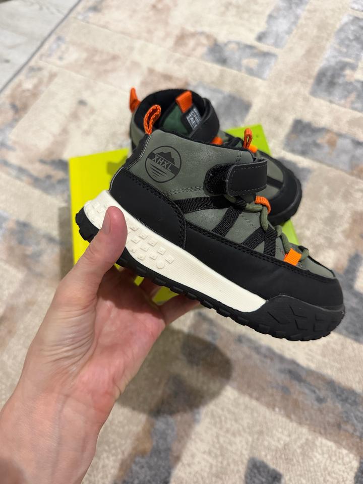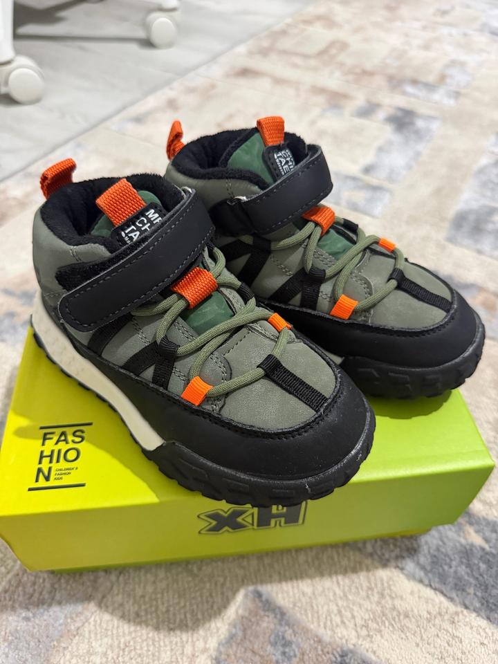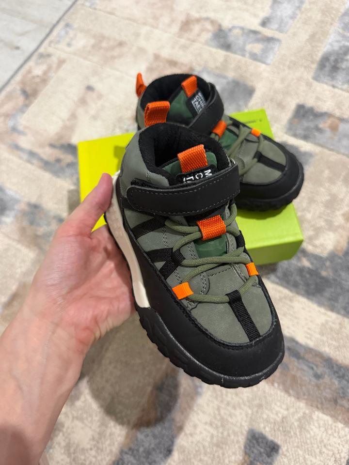 Хаки ботинки для мальчика с некоторыми вставками. Подкладка на основе флиса и стелька из текстиля. Без супинатора. Фиксация: шнуровка-резинка и ремешок. Толстая рифлёная подошва. Демисезон: весна, осень (теплая зима). Артикул: 554012