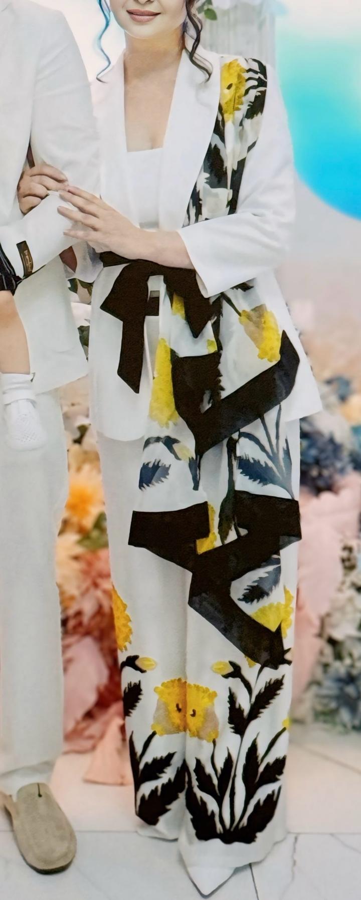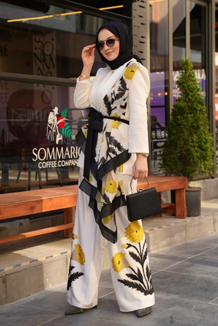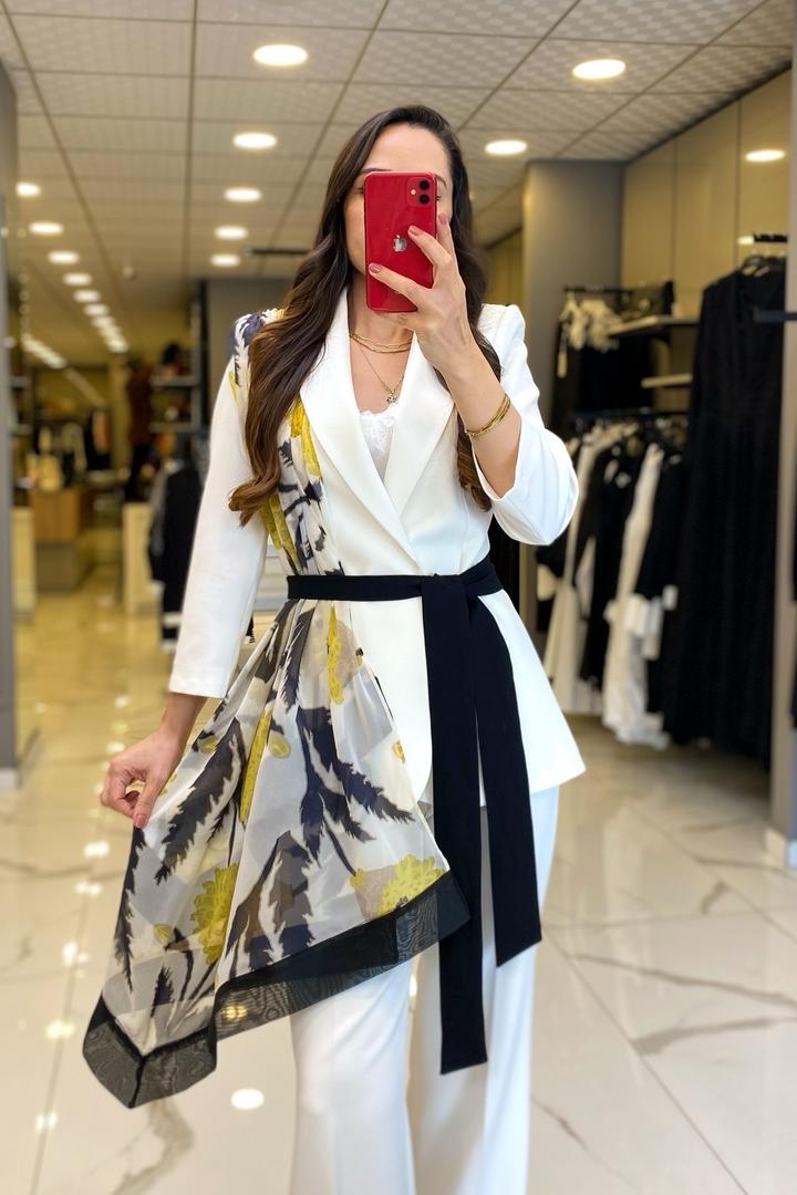 Модель Mianotte Omuzdan Şifon Şal Detaylı Ceket выполнена из креп-ткани с акцентной шифоновой шалью на плече и черным поясом на талии. Артикул: 554218
