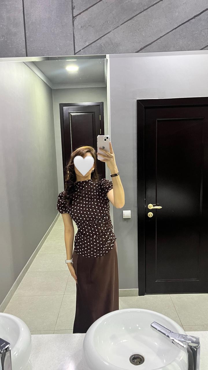 Блузка в горошек в коричневом цвете.Размер S-M.Одевала только 1 раз.Качество классное. Атласная юбка.Длинная.Тоже размер S-M.Одевала также 1 раз. Артикул: 554248