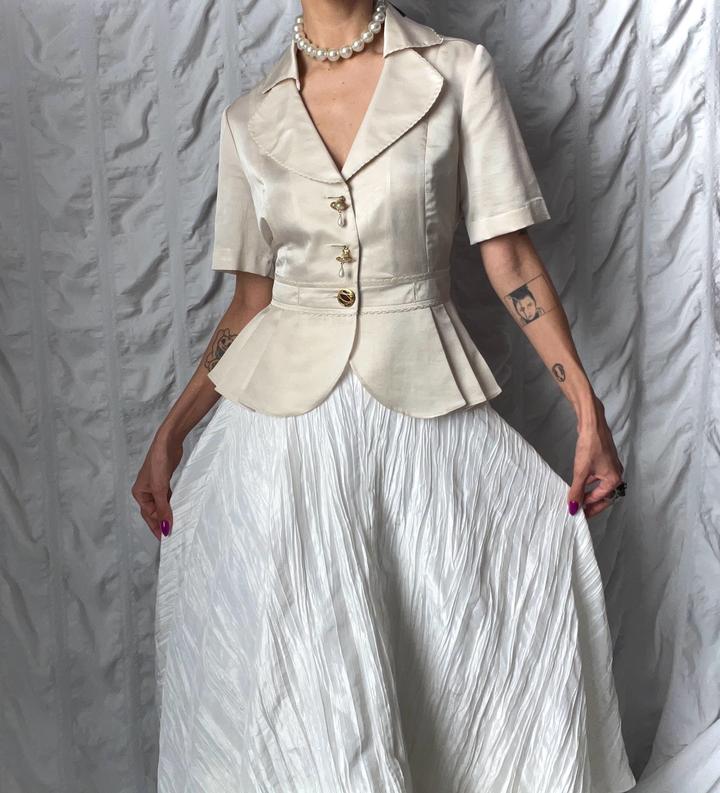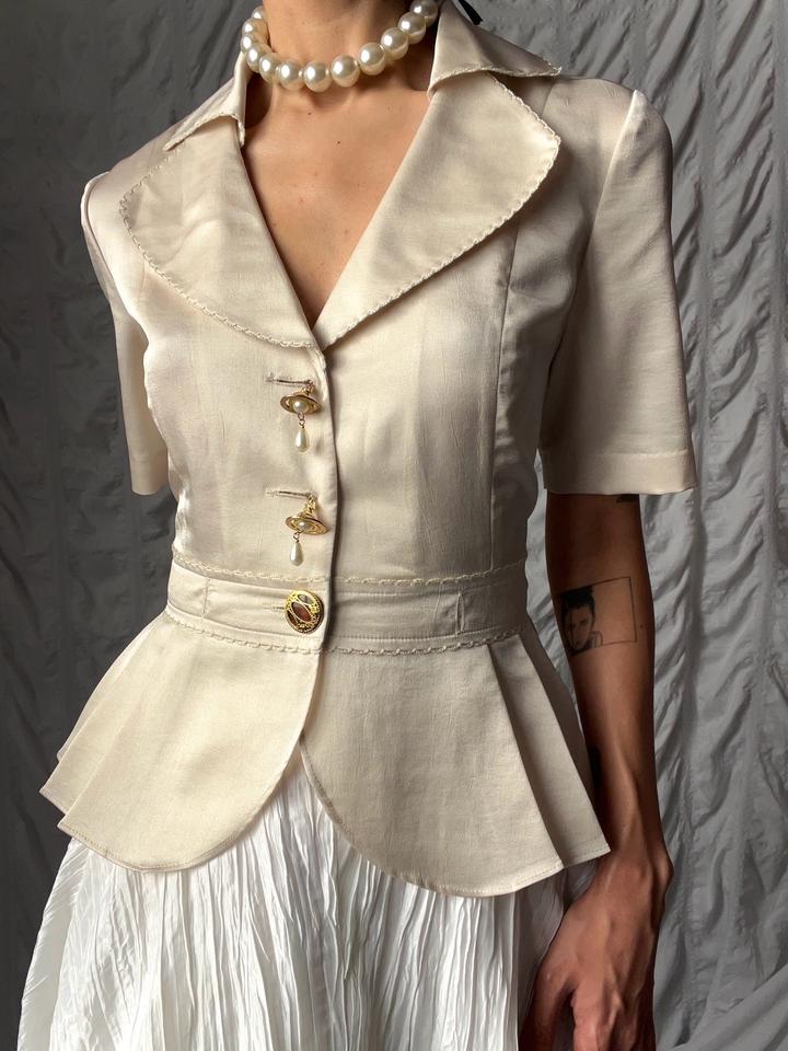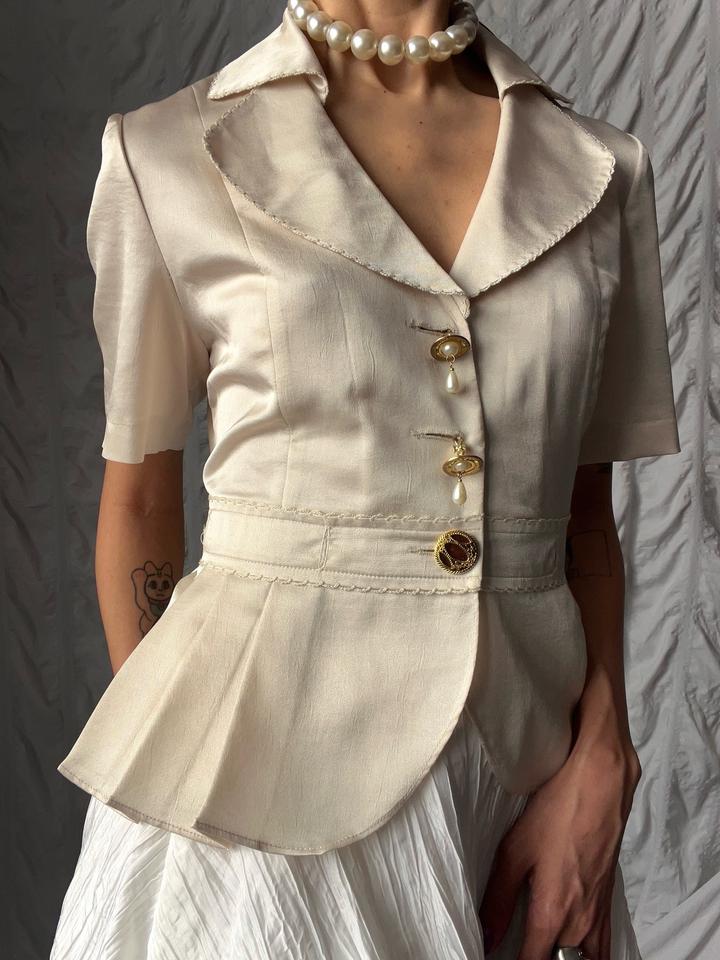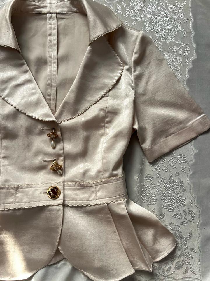 Блуза в стиле Vivienne Westwood 🤍 HE OPИГИНАЛ, указываю сразу :) Фасон и пуговицы оочень в стиле модного дома, знаменитый логотип идет буквально без отличий и с гравировкой VW снизу 🤍 Нежная ткань, отличное состояние вещи, сзади есть пояс, можно затянуть по талии. Размер S-M, мой рост 164 см, оттенок шампань, ткань по составу ближе к мягкой тафте 14.500 тенге Артикул: 554339