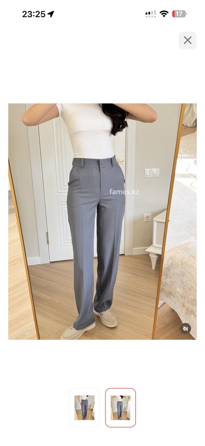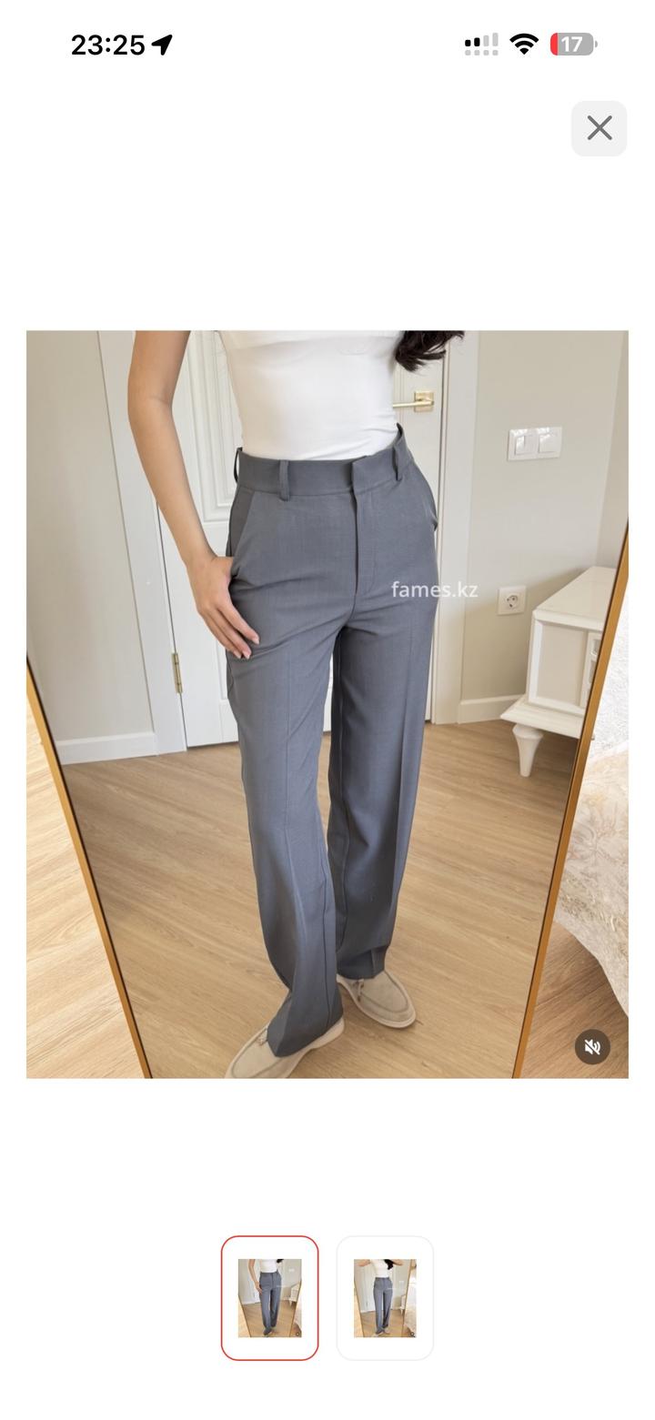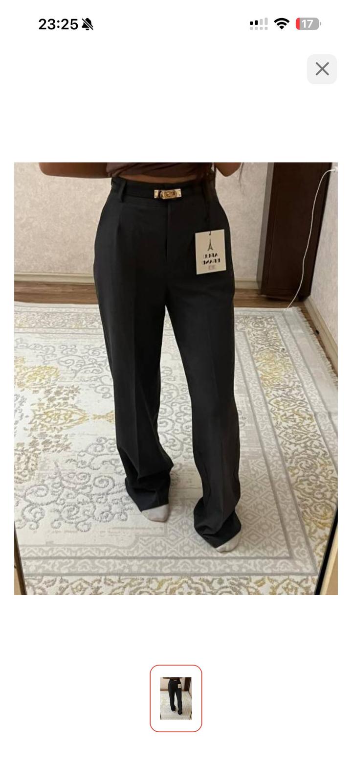 Заказывала на каспи, не подошли по размеру. Вернуть уже не могу так как срок прошел, я получила товар и сразу улетела 🥹. С биркой, примерила 1 раз и все. Новые. Размер 48, по факту 44-46. Выглядят как на фото, добавила фото с отзыва. На рост 175 по длине как раз. Материал костюмный - не легкий совсем. Артикул: 554729