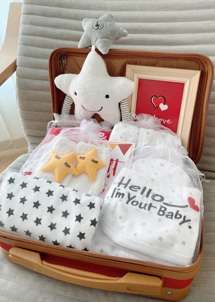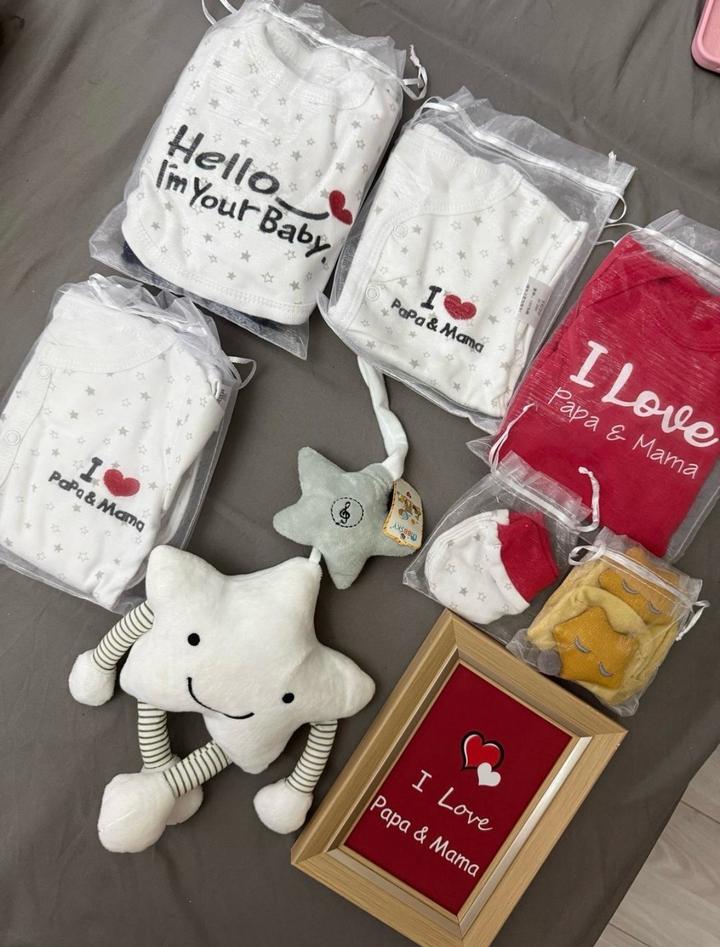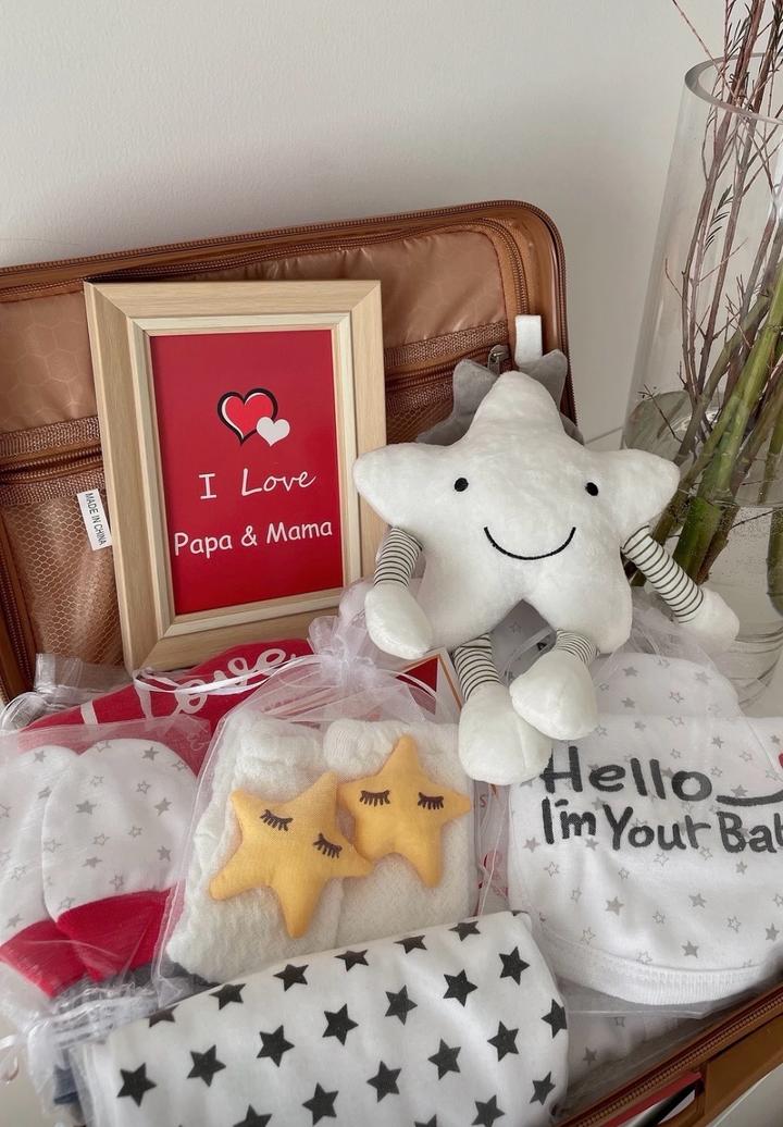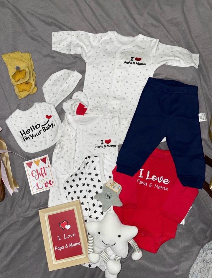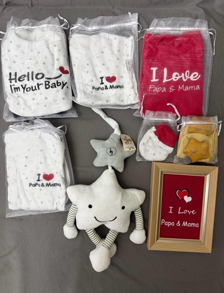 Новый подарочный комплект, чемодан плюс одежда хлопок 100 %. Размер одежды от 0-3 месяцев. Чемодан, игрушка, фото рамка, открытка, 3 шт Боди, 1 кофта, 1 штанишки, шапочка, носки, царапки, слюнявчик, упакованно в подарочный пакет. Игрушка играет музыку при нажатии. Подойдет и мальчикам и девочкам. Идеально подходит в качестве подарка для выписки и на рождение ребенка Артикул: 554937