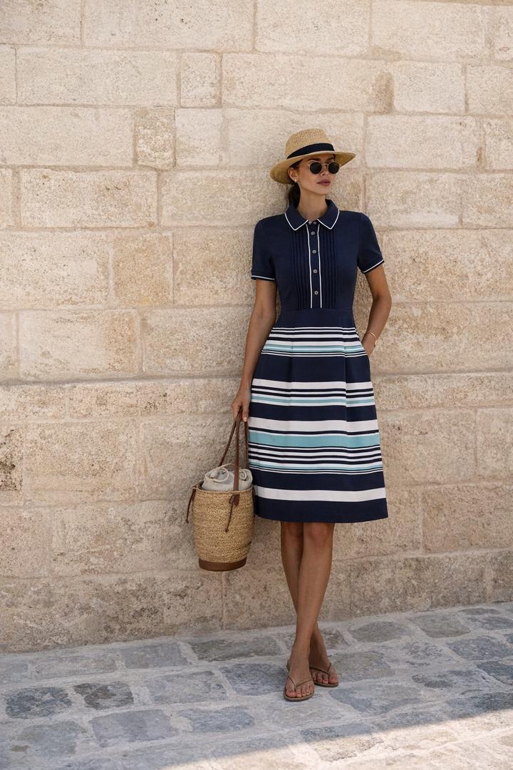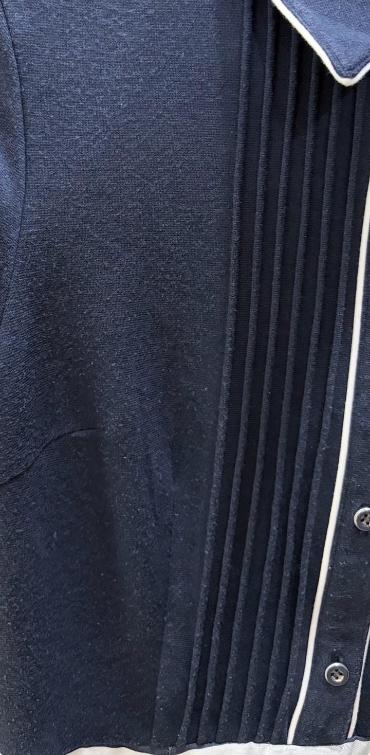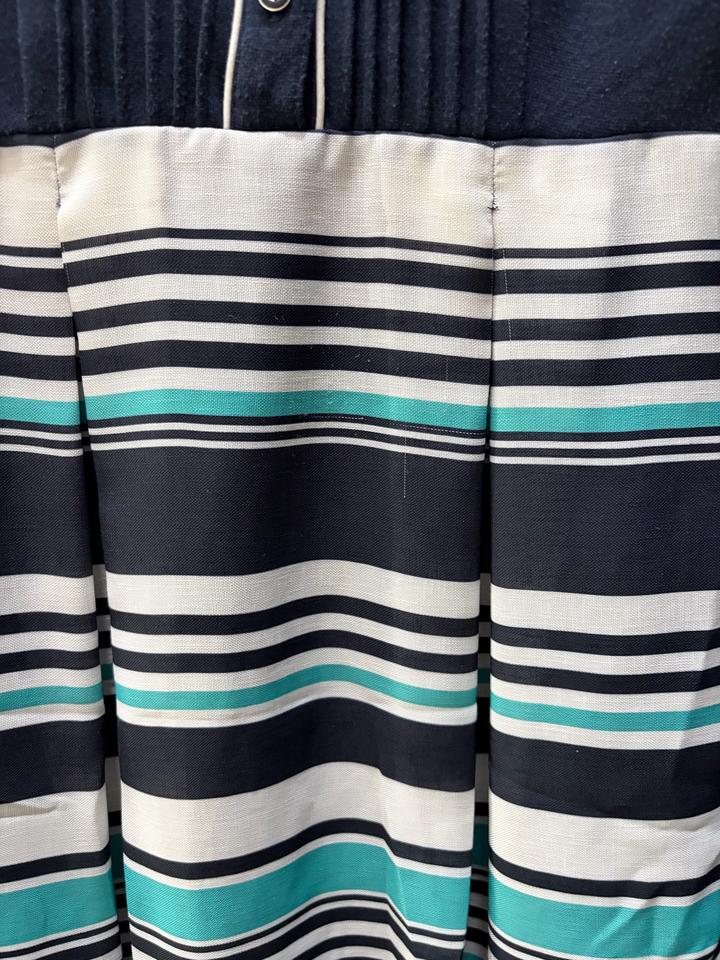 Платье в стиле polo, верх тёмно синий с воротником и планкой на пуговицах, декоративные защипы спереди на юбке. Длина до колена с горизонтальными полосами в белом и бирюзовом оттенках. Артикул: 554987