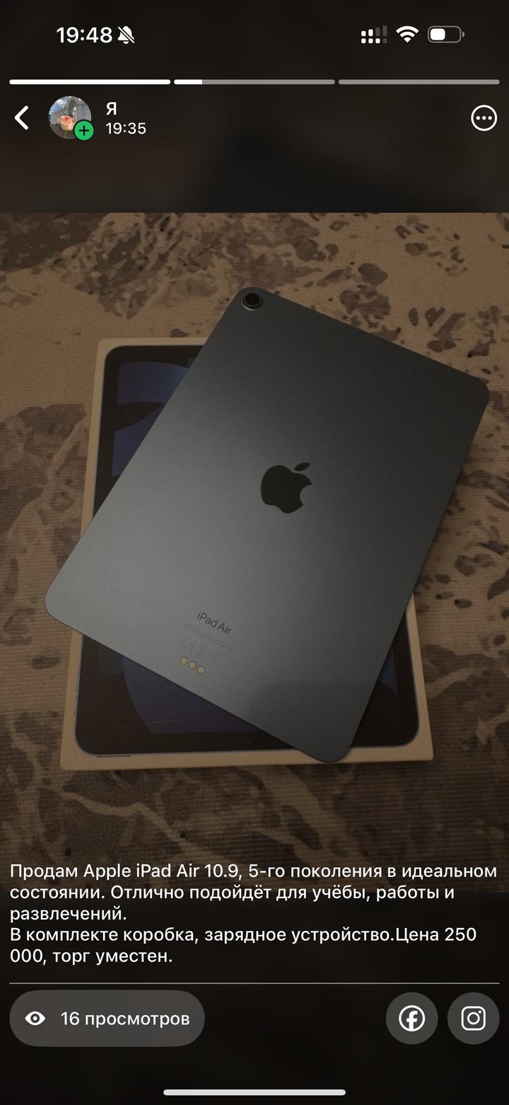Продам Apple iPad Air 10.9, 5-го поколения в идеальном состоянии. Отлично подойдёт для учёбы, работы и развлечений. В комплекте коробка, зарядное устройство. Артикул: 555000