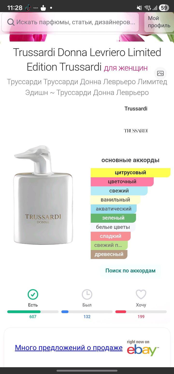 Trussardi Donna Levriero Limited Edition Trussardi новый в слюде. Покупала в летуаль. Яркий пудрово цветочный аромат. Артикул: 555285