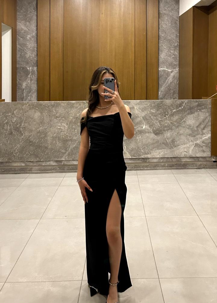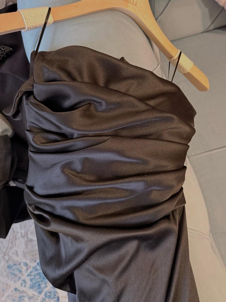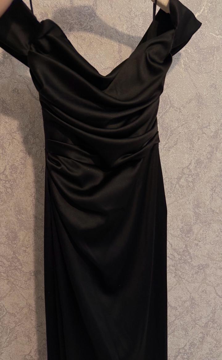 Чёрное сатиновое платье на вечер Идеально подходит под рост 165 с каблуками Носилось один раз Из дефектов В области груди есть каркасная металлическая вставка для формы, может слегка ощущаться при носке Артикул: 555678