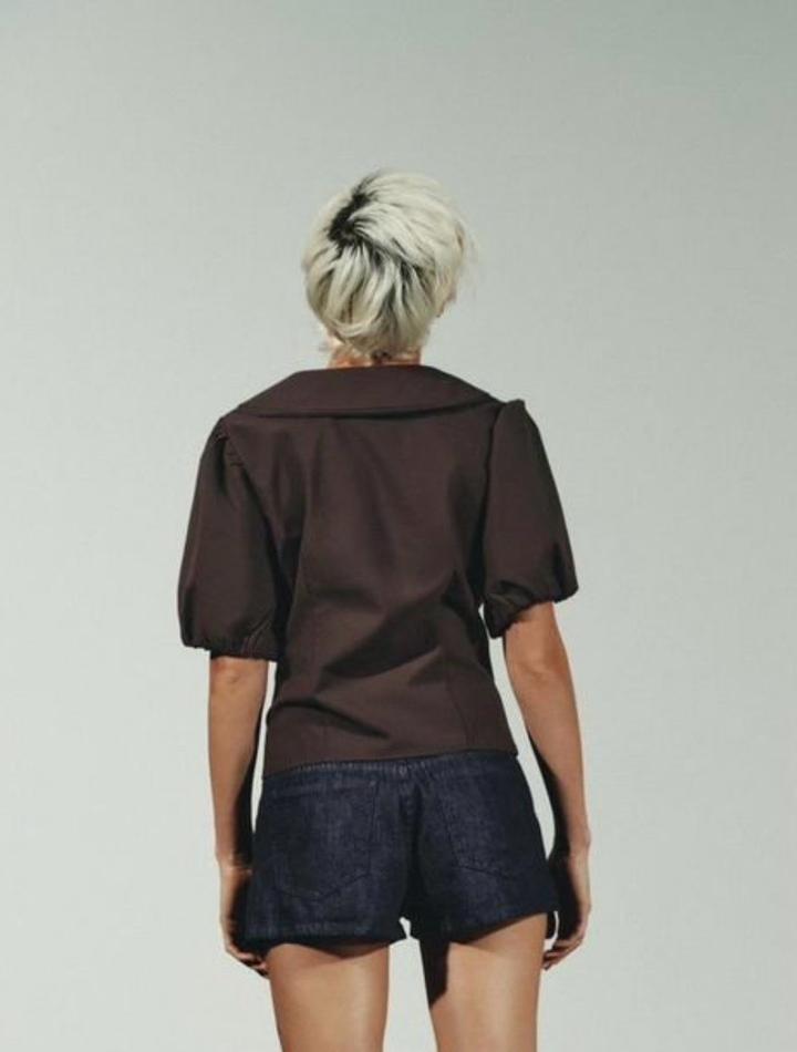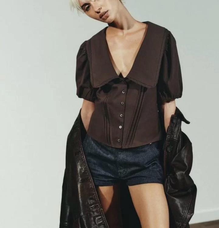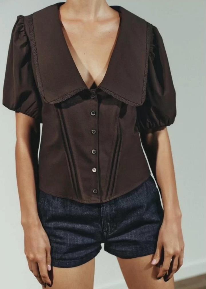 Новая блуза от Zara Размер М Цвет коричневый Покупался за 19.990 Акцентный воротник, рукава фонарики, подчеркнутая зона талии на пуговицах Артикул: 555691