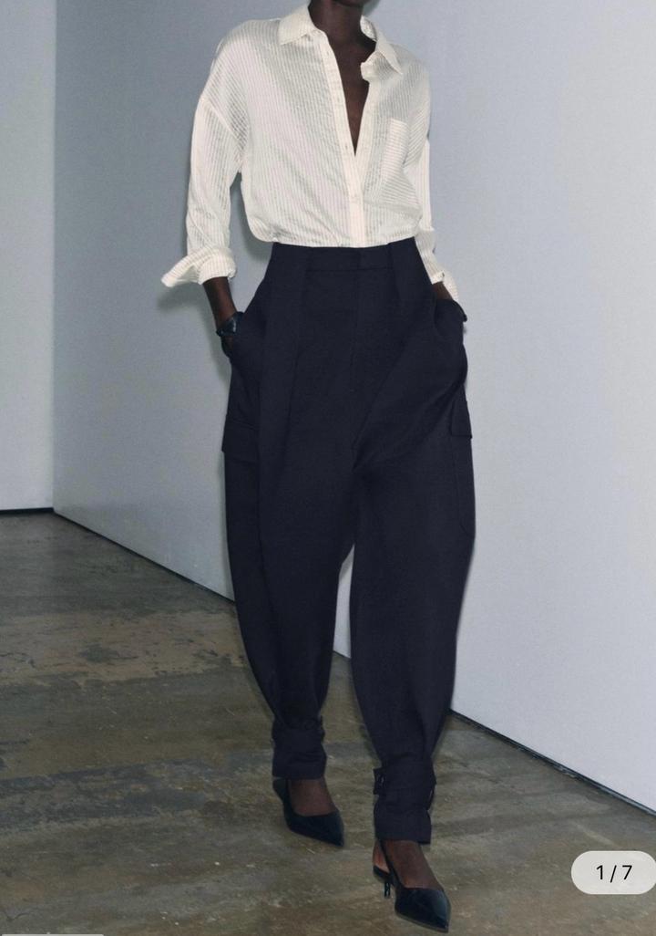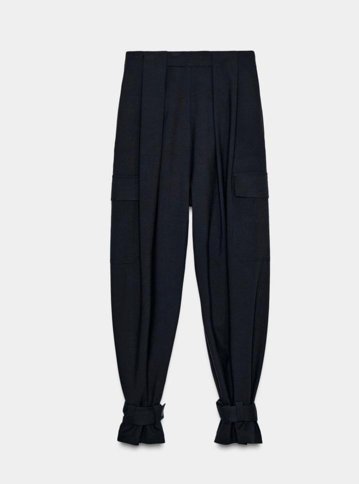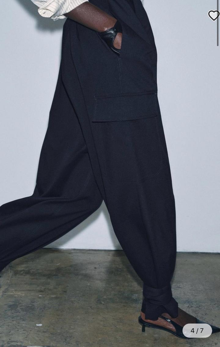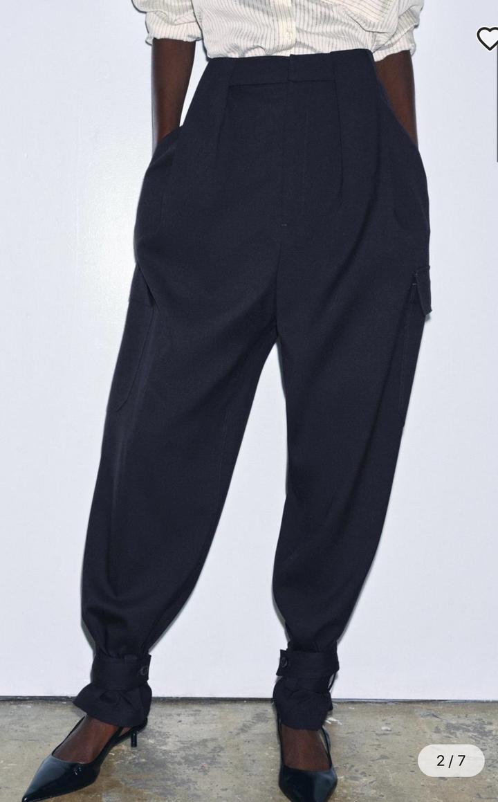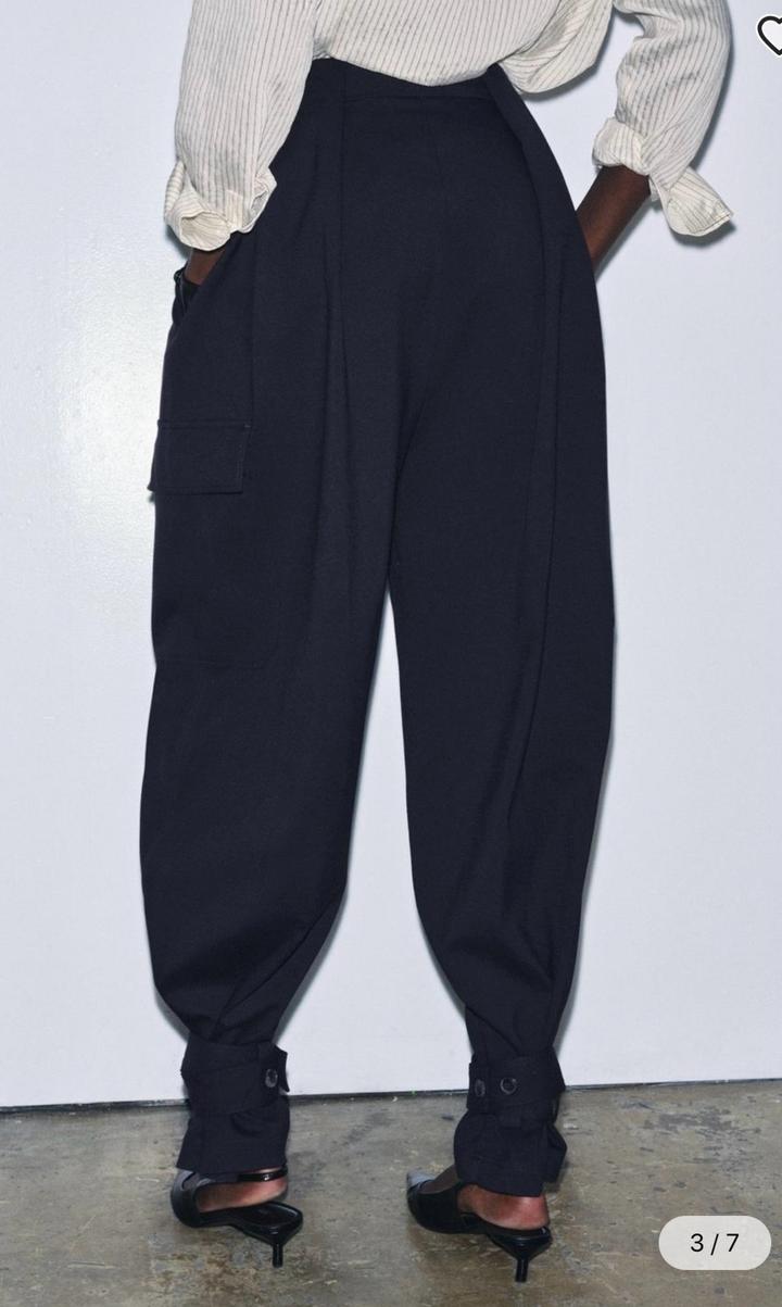 Новые брюки-карго Zara Размер S, но большемерят до М Цвет морской темно-синий Коллекция Zara «ZW» за 49.990, накладные карманы с клапанами на брючинах. Детали в виде складок. Регулируемые завязки и пуговица по нижнему краю. Застежка-молния, пуговица и металлические крючки Артикул: 555705