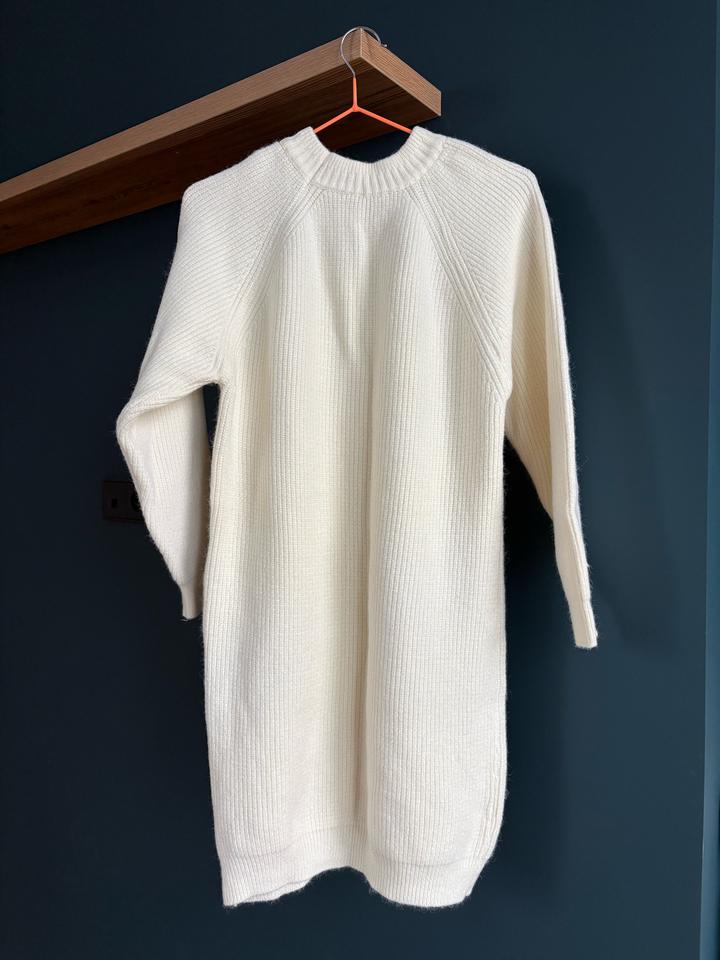 Платье-туника. Цвет белый или слоновая кость. Чистое, аккуратное, не вытянутое. Материал наверное хлопок, вискоза. Можно носить в беременность холодной осенью, зимой. Подойдет на размер S - M Артикул: 555711