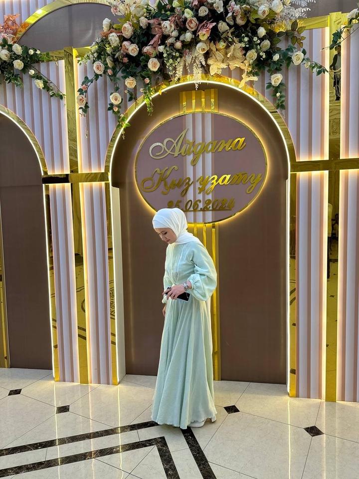 элегантное вечернее мусульманское платье нежно-мятного цвета, выполненное в закрытом стиле с длинными объемными рукавами. Подобные модели часто изготавливаются из таких тканей, как органза, Артикул: 555819