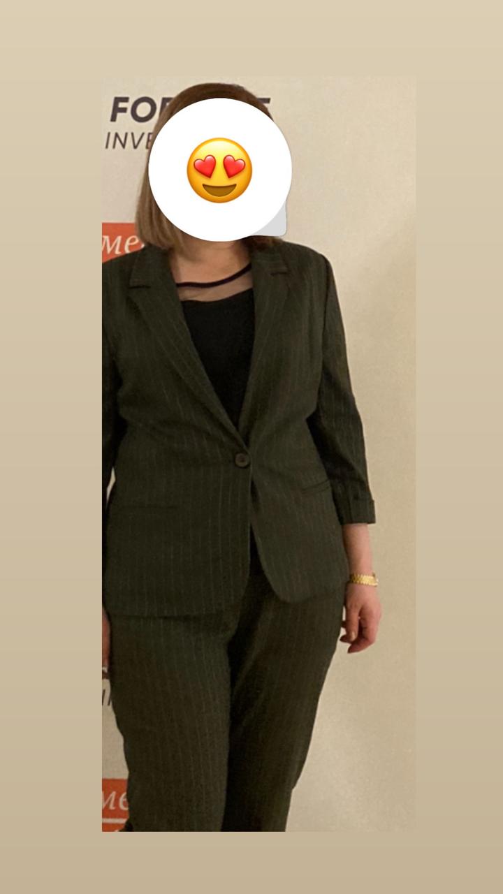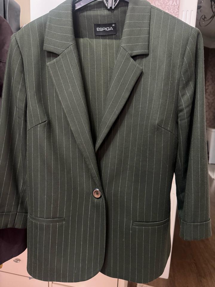 Зелёный женский брючный костюм в полоску, в отличном состоянии. Надевался всего 2 раза на семинар. Покупался за 65 000 тг. Артикул: 555840
