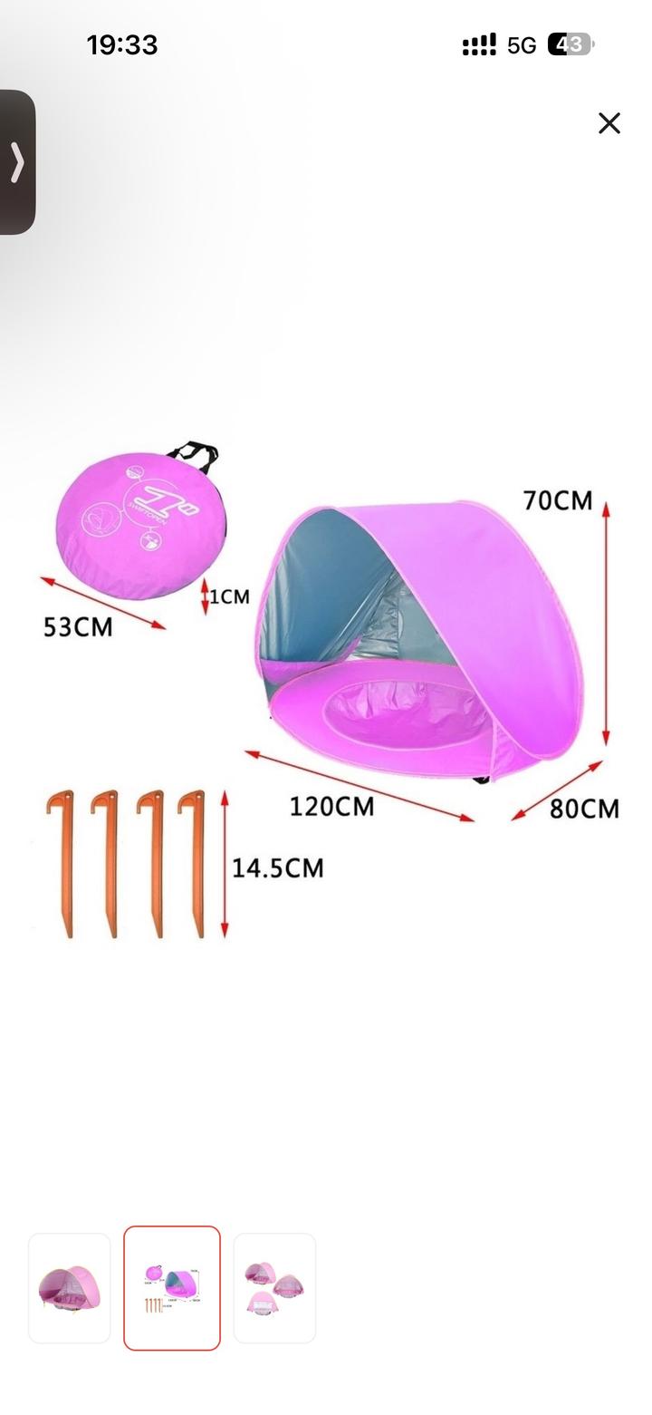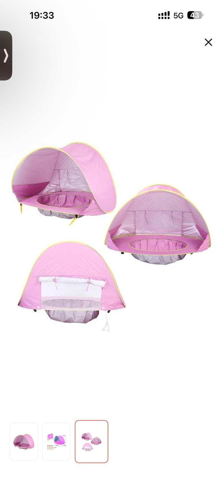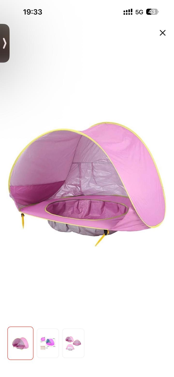 Новая детская палатка с бассейном, собирается компактно, удобно взять с собой в отпуск. Солнцезащитная отражающая ткань, есть окошко на задней стенке можно открыть чтобы продувало. В комплекте чехол и фиксаторы в песок. Артикул: 556590