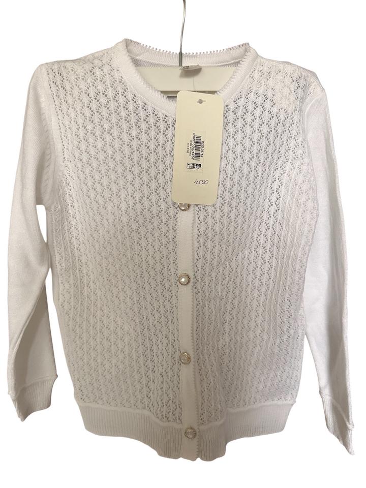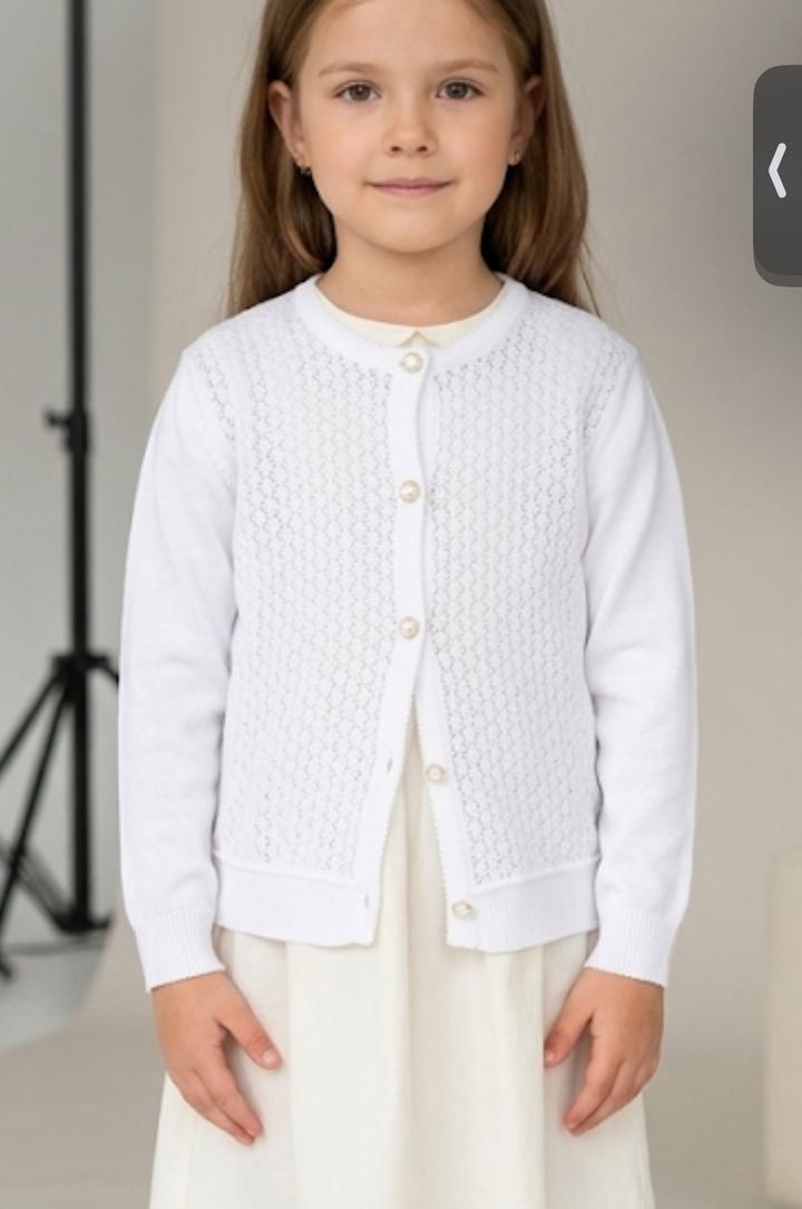 Белая кофточка, тонкой вязки. Новая. Цена 2000. Рост 110 и 116. Длина изделия по спинке 41 см, длина рукава 36 см Артикул: 556666