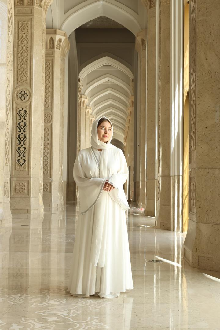Внутри есть длинное платье сарафан, и накидка со стразами, и в комплекте свой шарф, размер 46-48, одевала только один раз на мечеть и все Артикул: 556731