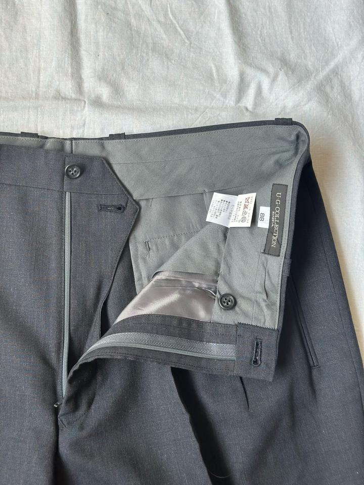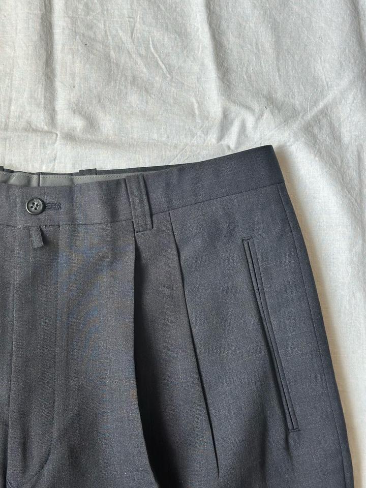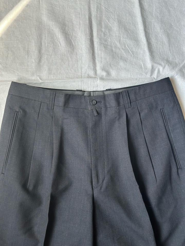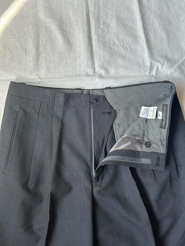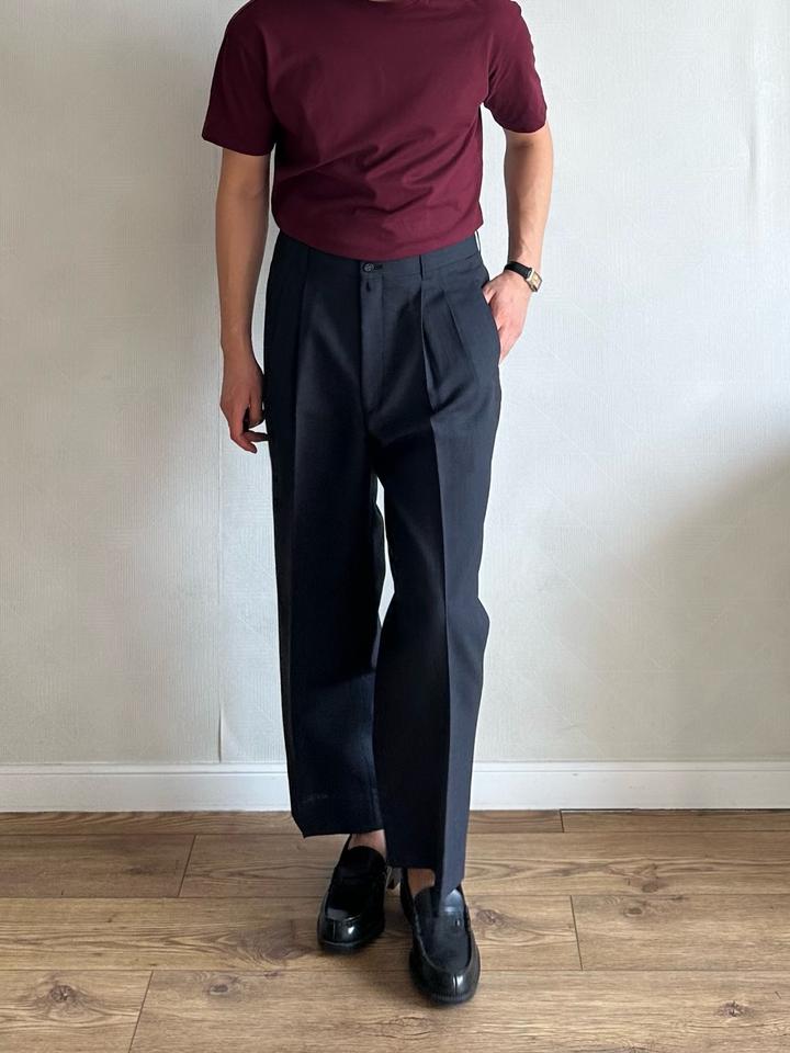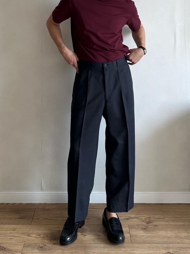 U-G-Collection | L (W34 L30) Широкие брюки с высокой посадкой и с двойными защипами в темном графитовом оттенке. Тонкий материал из 60% шерсти и 40% пэ. Талия 88 Бедра 128 Посадка 33 Выход 24 Длина 100 (запас +3см) Made in China 🇨🇳 Параметры модеди: рост 183, размер М-Л Артикул: 557019