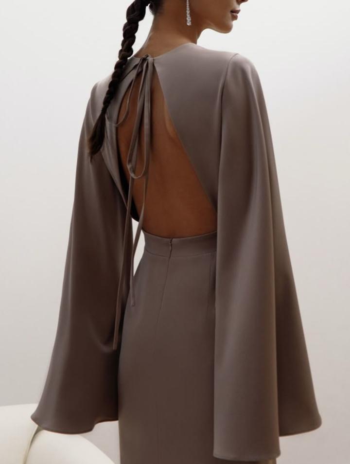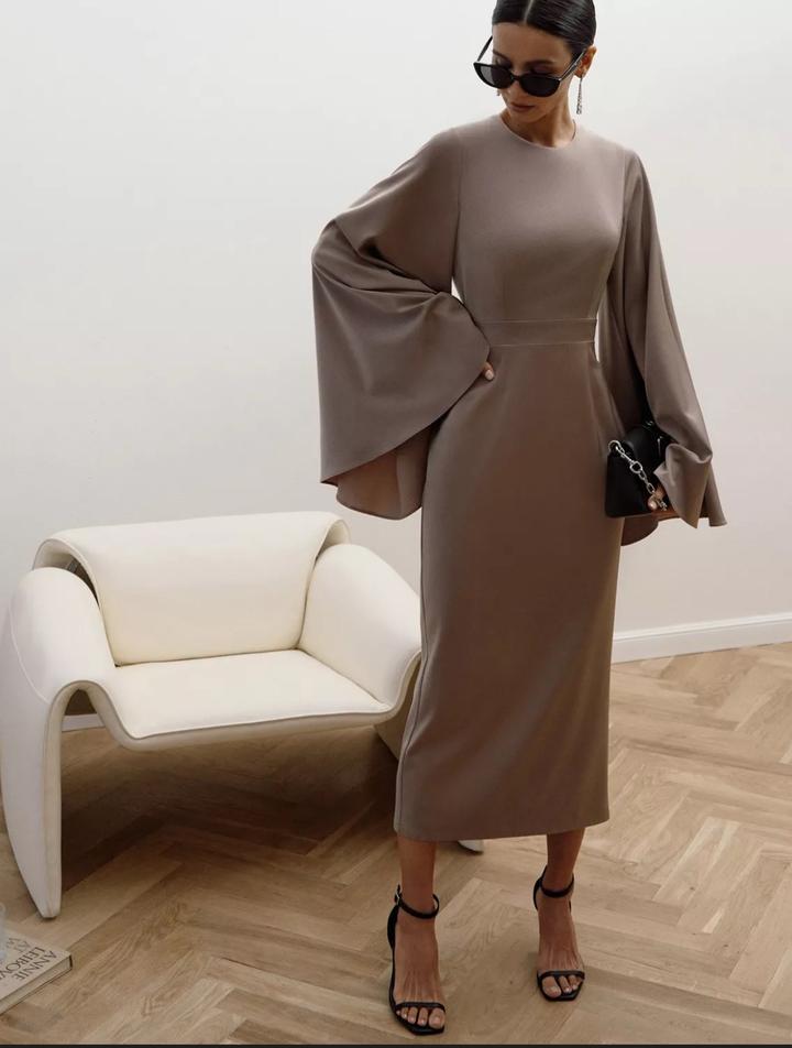 Это элегантное платье-футляр от Lichi в кофейном оттенке с закрытым передом и эффектными расклешенными рукавами. Главная деталь — глубокий чувственный вырез на спине, который контрастирует с лаконичным силуэтом миди. Модель выполнена из плотной ткани, идеально подчеркивающей фигуру.Надевала 1 раз на выпускной. В идеальном состоянии. Артикул: 557108