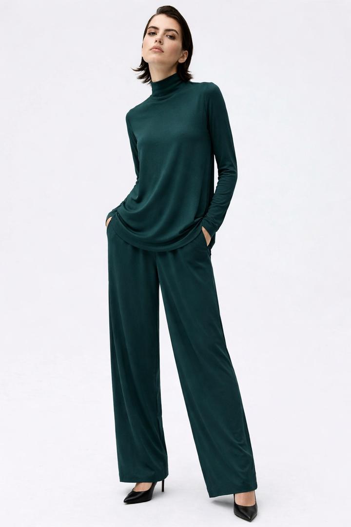 Элегантный комплект в насыщенном изумрудном оттенке 💚 Состоит из свободного лонгслива с высоким горлом и широких брюк. Ткань струящаяся, невесомая, красиво ложится по фигуре. Создаёт эффект расслабленной роскоши. Брюки с высокой посадкой и свободным кроем визуально вытягивают силуэт. Подойдет на размер S-M Артикул: 557517