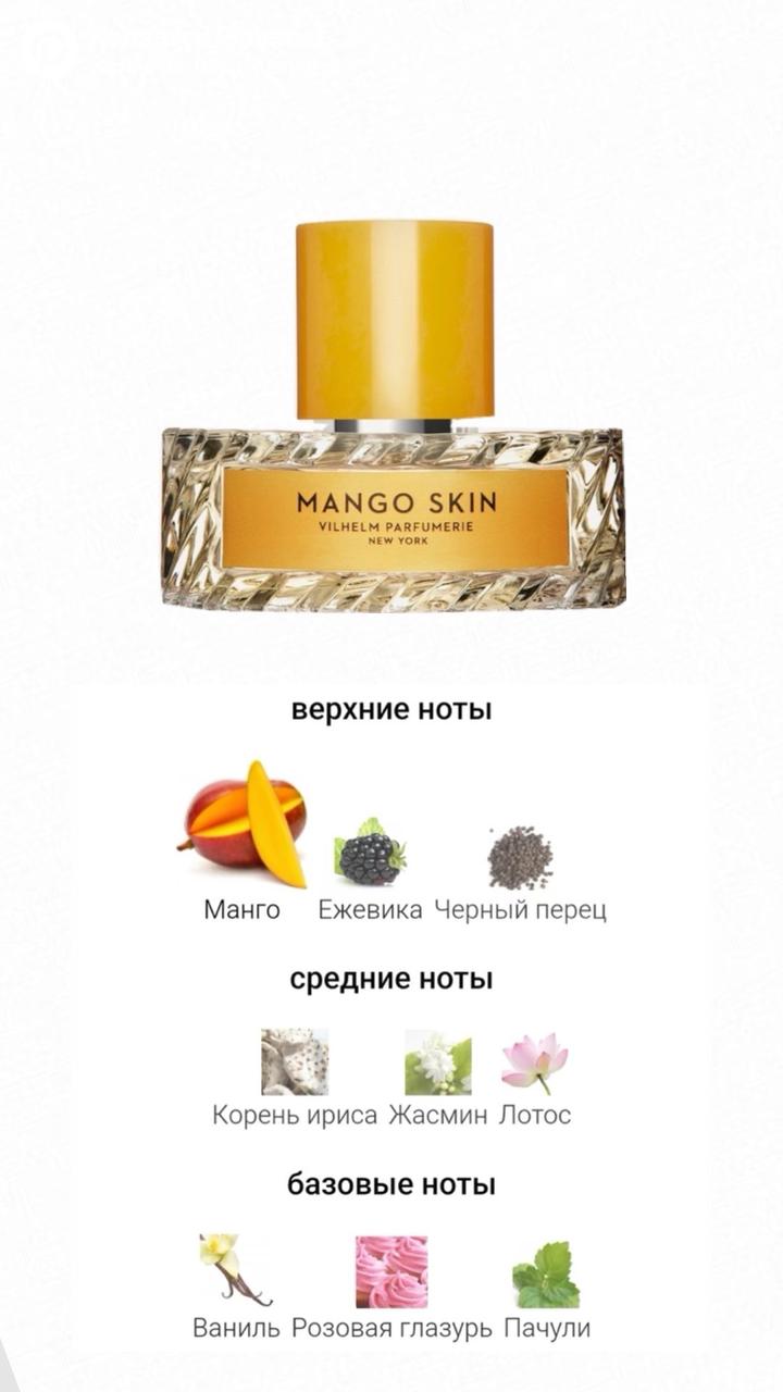 Топ духов с нотами манго 1. Mango Skin – Vilhelm Parfumerie • Очень известный аромат • Пахнет спелым, сладким, немного “перезрелым” манго + ваниль Парфюм 80 мл остаток из 100 мл В коробке в комплекте Артикул: 557598