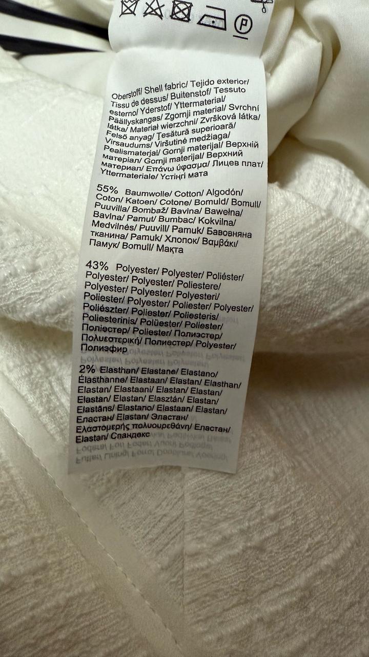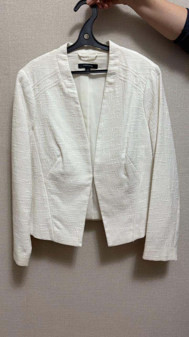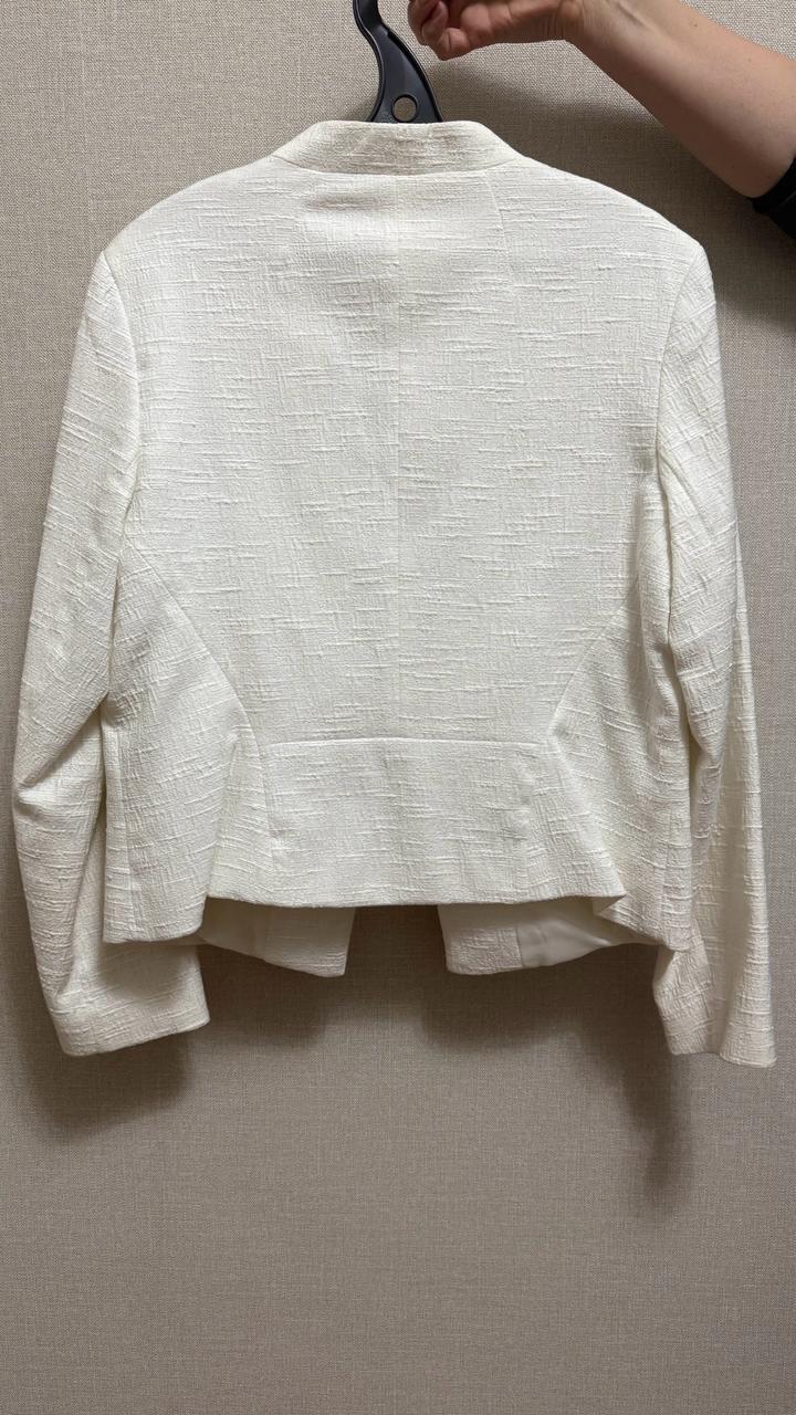Элегантный укороченный пиджак молочного оттенка с фактурной тканью. Минималистичный крой без застёжек красиво подчеркивает силуэт и подходит как для офиса, так и для повседневных образов. Лёгкий и комфортный, хорошо держит форму. Артикул: 557950