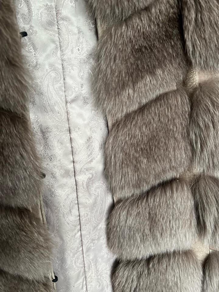 Жилет из песца выполнен из натурального меха. В премиальном качестве. Мех пушистый густой. Цвет нейтрально коричневый-серый или можно сказать мокко оттенок. Размер жилетки подойдет на 42/44/46. Артикул: 558140