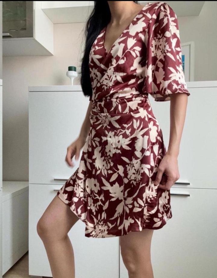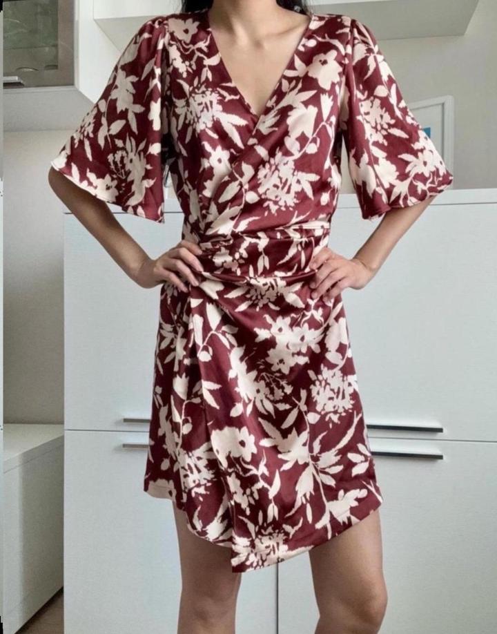 Лёгкое платье с цветочным принтом в бордово-кремовой цветовой гамме. Запах и V-образный вырез и свободные рукава. ПРОДАЮ ВСЕ ВЕЩИ ТОЛЬКО ДО КОНЦА АПРЕЛЯ . Артикул: 558261