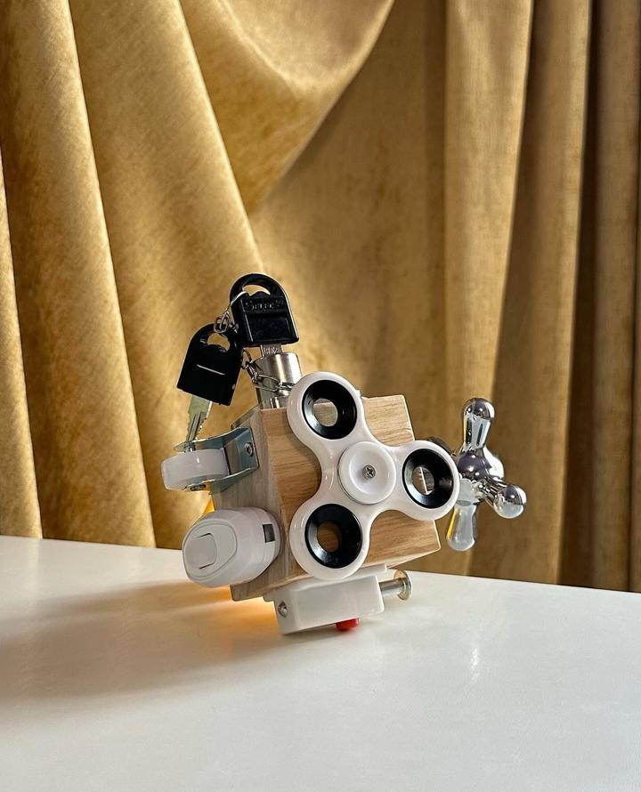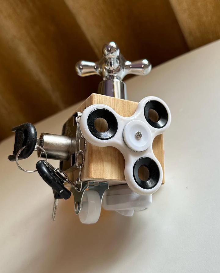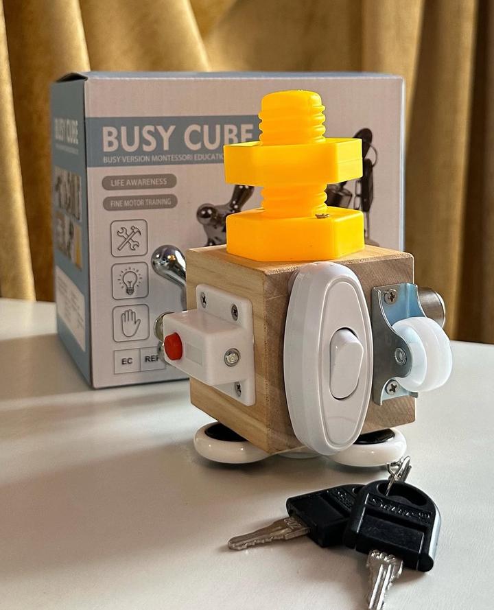 Многофункциональный компактный бизикуб. Абсолютно НОВЫЙ, в коробке. Игрушка включает в себя спиннер, щеколда с кнопкой, выключатель, колесо, замок с ключом, винт с гайкой и кран. Артикул: 558499